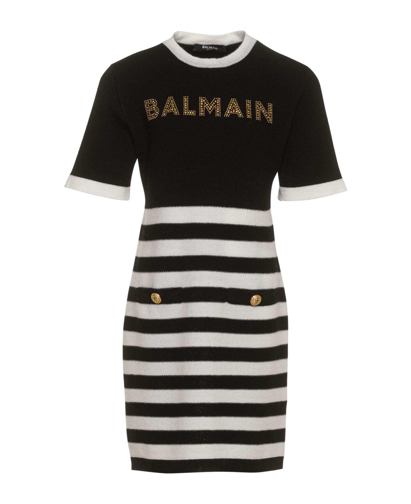 crystal-embellished striped dress from Balmain Kids featuring black/white, wool blend, logo print to the front, crystal embellishment, horizontal stripe print, round neck, short sleeves and straight hem. Composition: Lana, 94% , Poliammide, 5% , Elastam, 1%