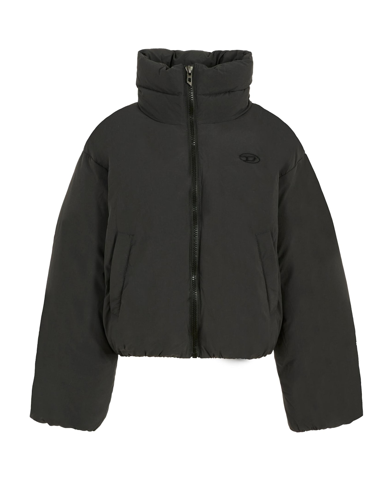 Black heavyweight, padded and quilted crop down jacket, long sleeves, with a high collar, front zip fastening, side pockets, elasticated cuffs and hem. It is embellished with an embroidered logo on the chest.