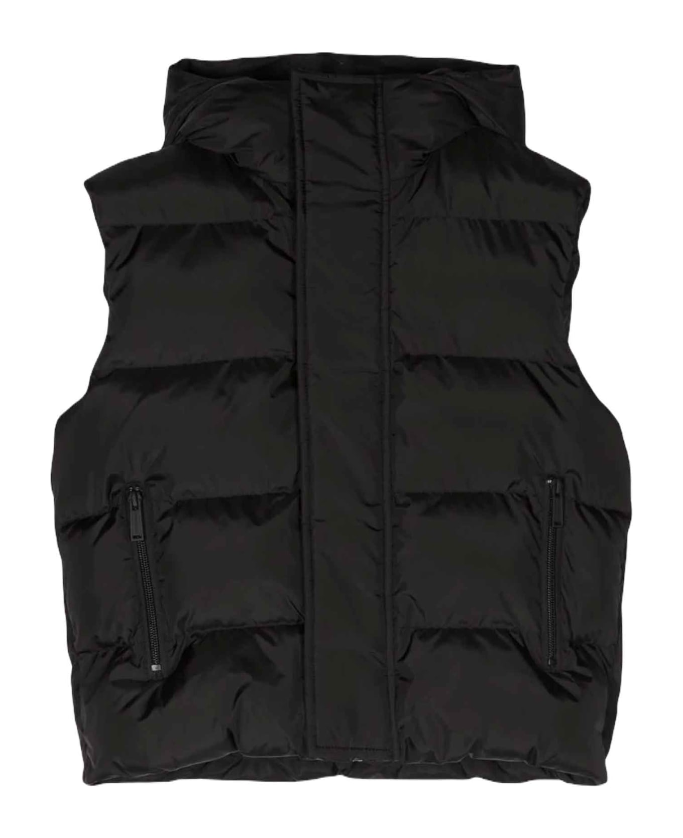 black vest unisex. Padded design, back logo print, hooded, high collar, front concealed closure, sleeveless and front zip pockets. Nylon 100%