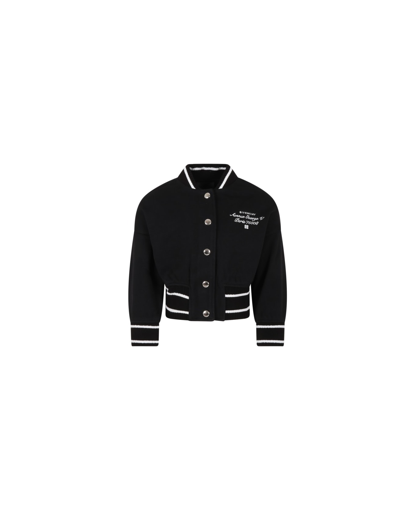 logo-embroidered bomber jacket from Givenchy Kids featuring black/white, cotton blend, jersey knit, embroidered logo at the chest, signature 4G motif, embroidered logo to the rear, ribbed band collar, front press-stud fastening, drop shoulder, long sleeves, ribbed cuffs, ribbed hem, embroidered address motif and French terry lining.