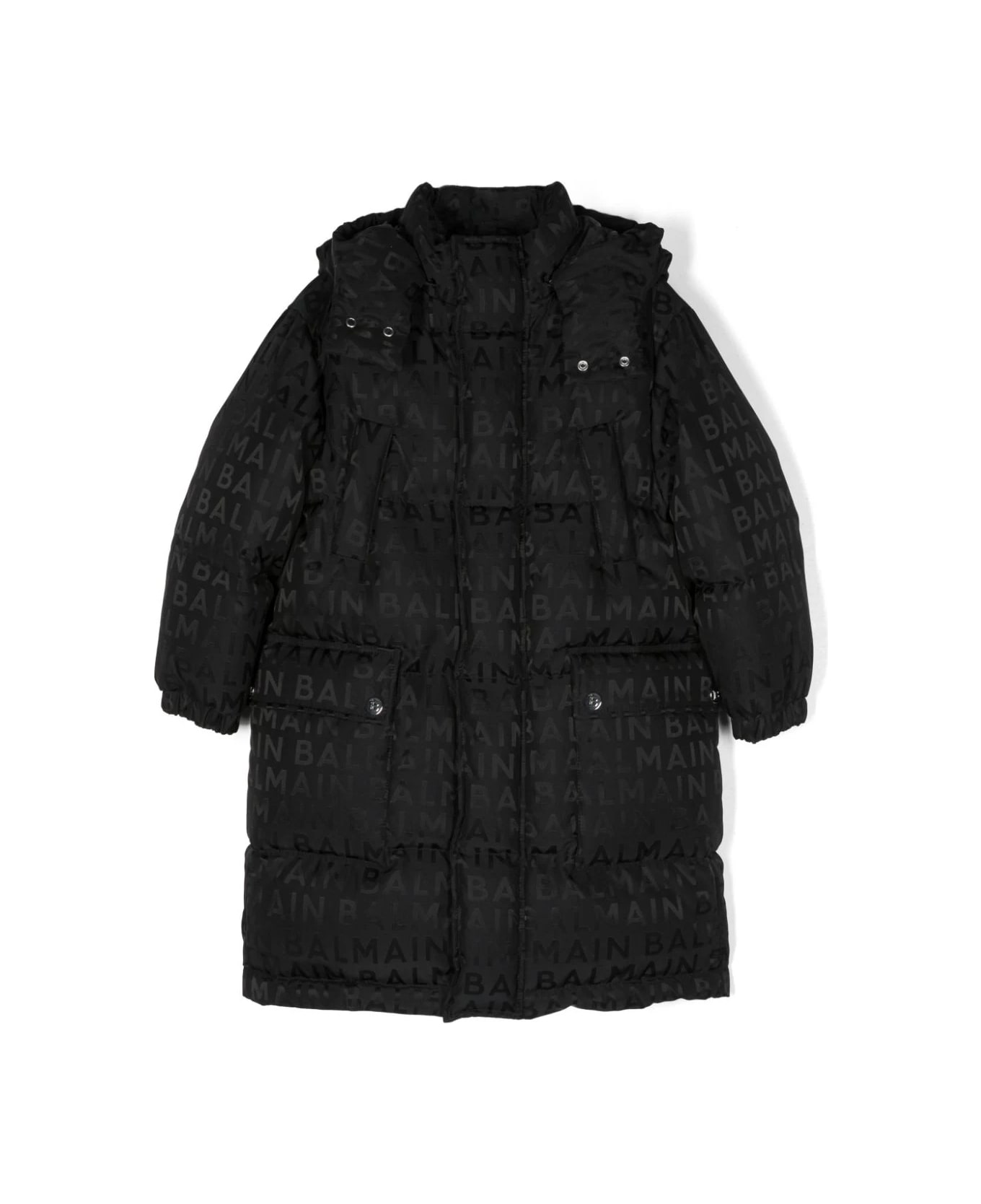 Black, goose down padding, padded design, logo jacquard pattern, embossed logo buttons, hood, front press stud closure, hidden front closure, long sleeves, two welt pockets on the chest, two flap pockets on the straight chest and hem. Composition Exterior: Polyester 100%, Polyamide 66%, Cotton 34% Lining: Polyamide 100%, Goose Down 80%, Feathers 20%