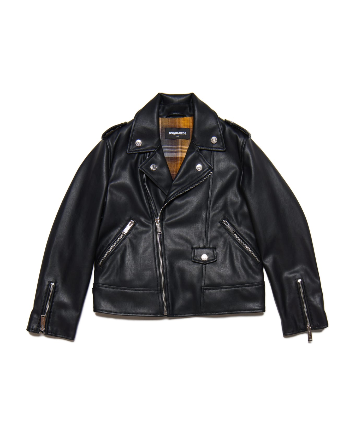 Long-sleeved biker jacket made of synthetic leather with contrasting inner lining with check pattern. Features several zippers: on the front closure, on the pockets and at the cuffs. The back features a logo patch and metal buckles on the bottom. An original and characterful garment, ideal for different occasions of use.