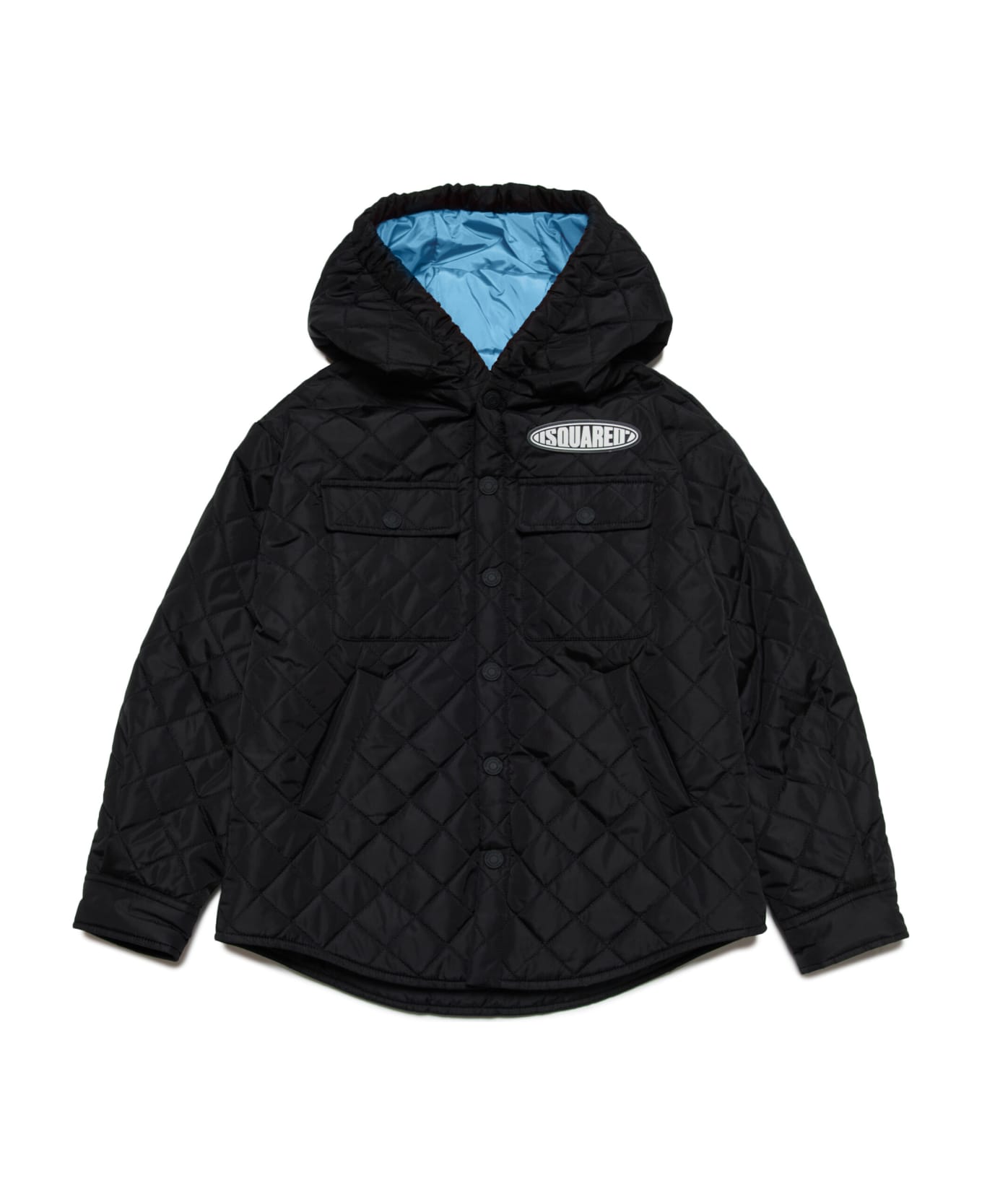 Nylon lightweight padded jacket with hood. Fake down padding and diamond quilting. Button closure. Featuring a rubberized surf-inspired Dsquared2 branded patch on the front heart side. Welt pockets and front button pockets. Contrasting color inner lining. Slant-cut bottom. An urban style ideal for a variety of occasions.