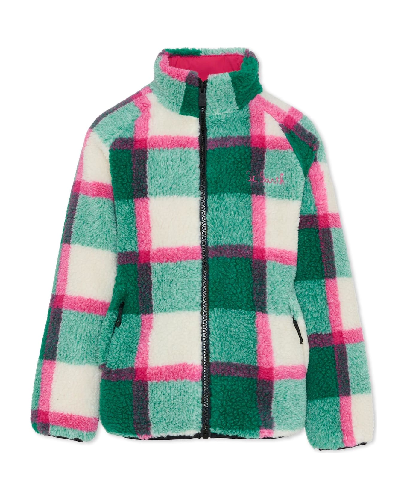 Green checked faux shearling coat with long sleeves, a crew neck, a front zip fastening, side zip pockets, and elasticated cuffs and hem. It is decorated with an embroidered logo on the chest.