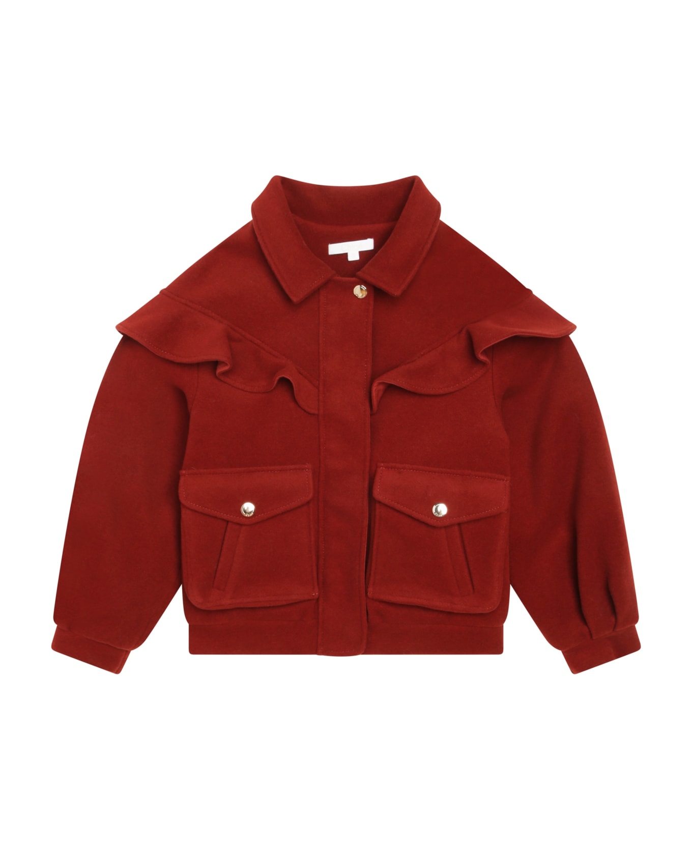 frilled-trim zip-up jacket from CHLOÉ KIDS featuring crimson, lambs wool, ruffled trim, classic collar, front zip fastening, concealed front fastening, long wide sleeves, two front flap pockets and straight hem. Composition: Esterno: Lana Di Agnello, 100% , Poliammide, 100%