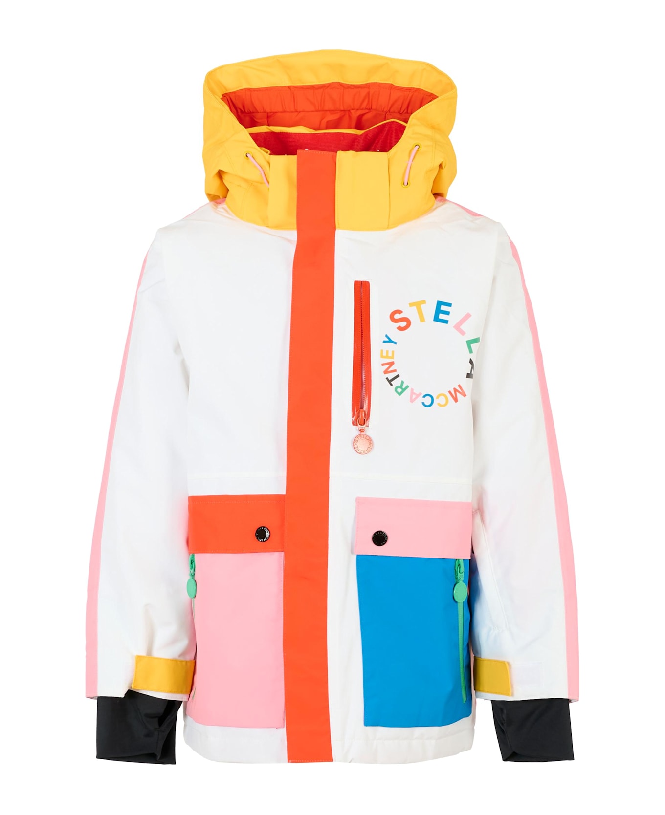 White snow jacket with long sleeves, fleece back lining, foldable and adjustable hood, neck guard, underarm ventilation zippers with mesh lining, glove clip, headphone hole, inside pockets for goggles and device, adjustable wind belt, Velcro adjustable cuffs, wind cuffs with thumb hole, ski pass pocket. It is embellished with logo on the front.