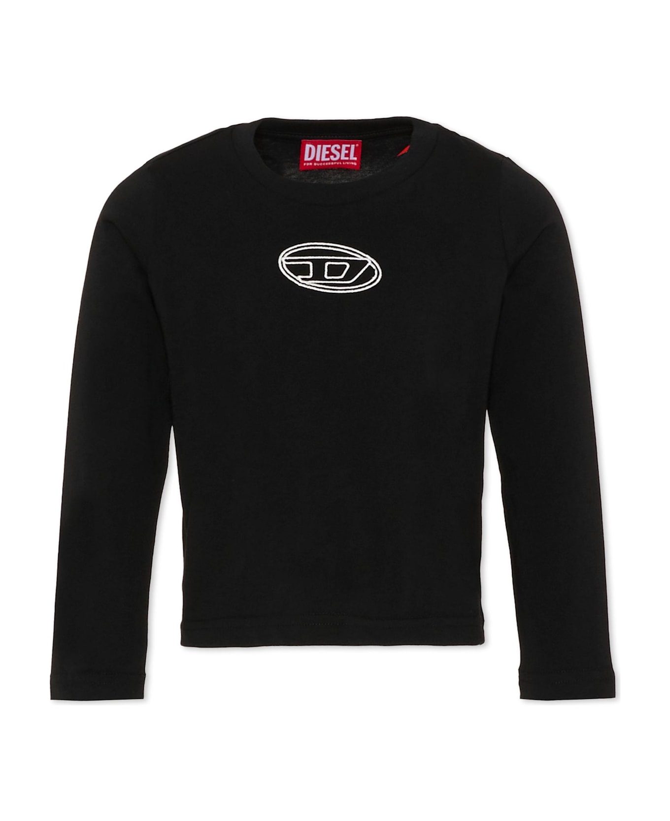 Black cotton T-shirt with long sleeves, crew neck and ribbed hem. It is embellished with white logo embroidered on the front.