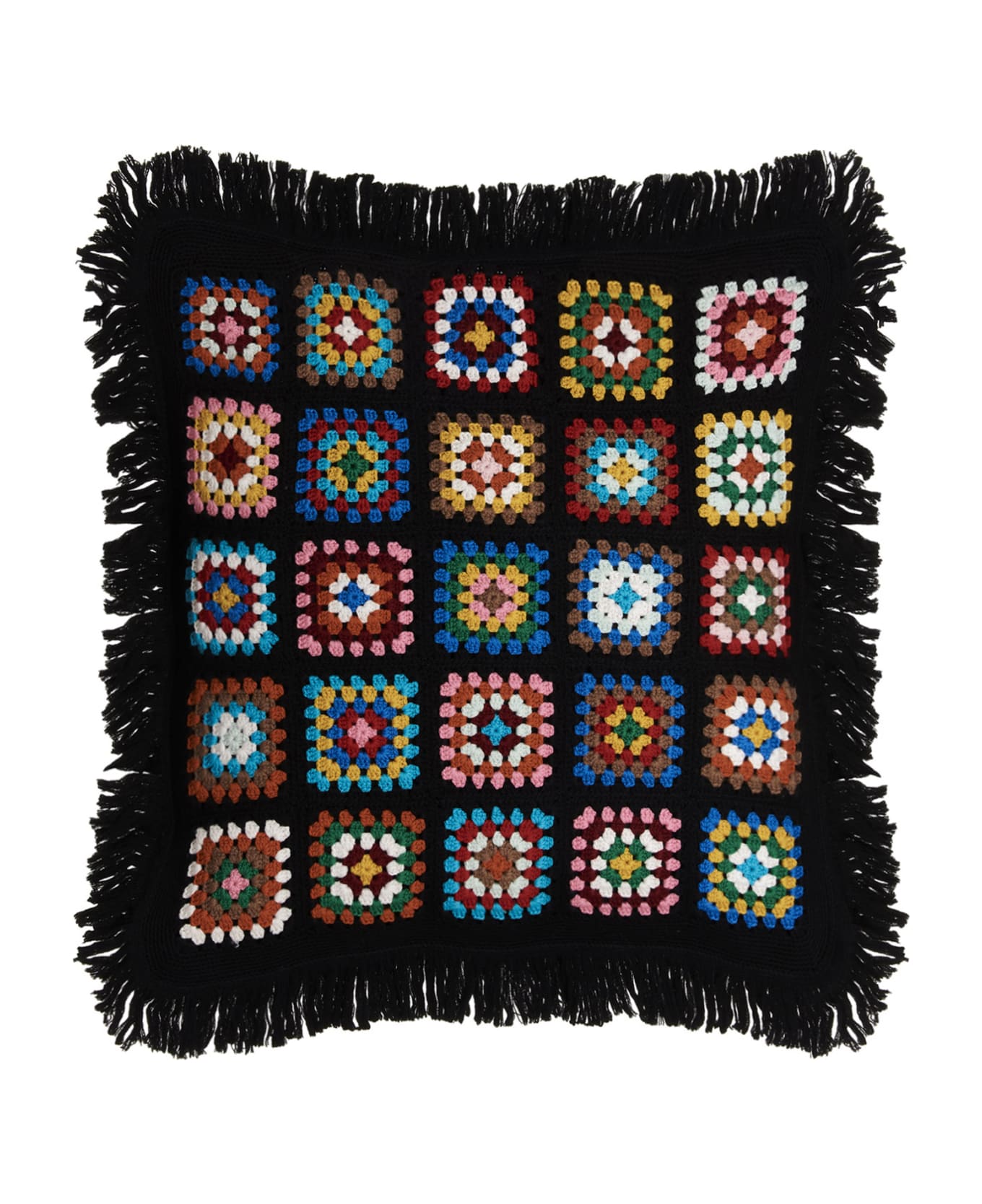 'Positive vibes' patchwork cotton crochet cushion with fringes at the sides. Composition: