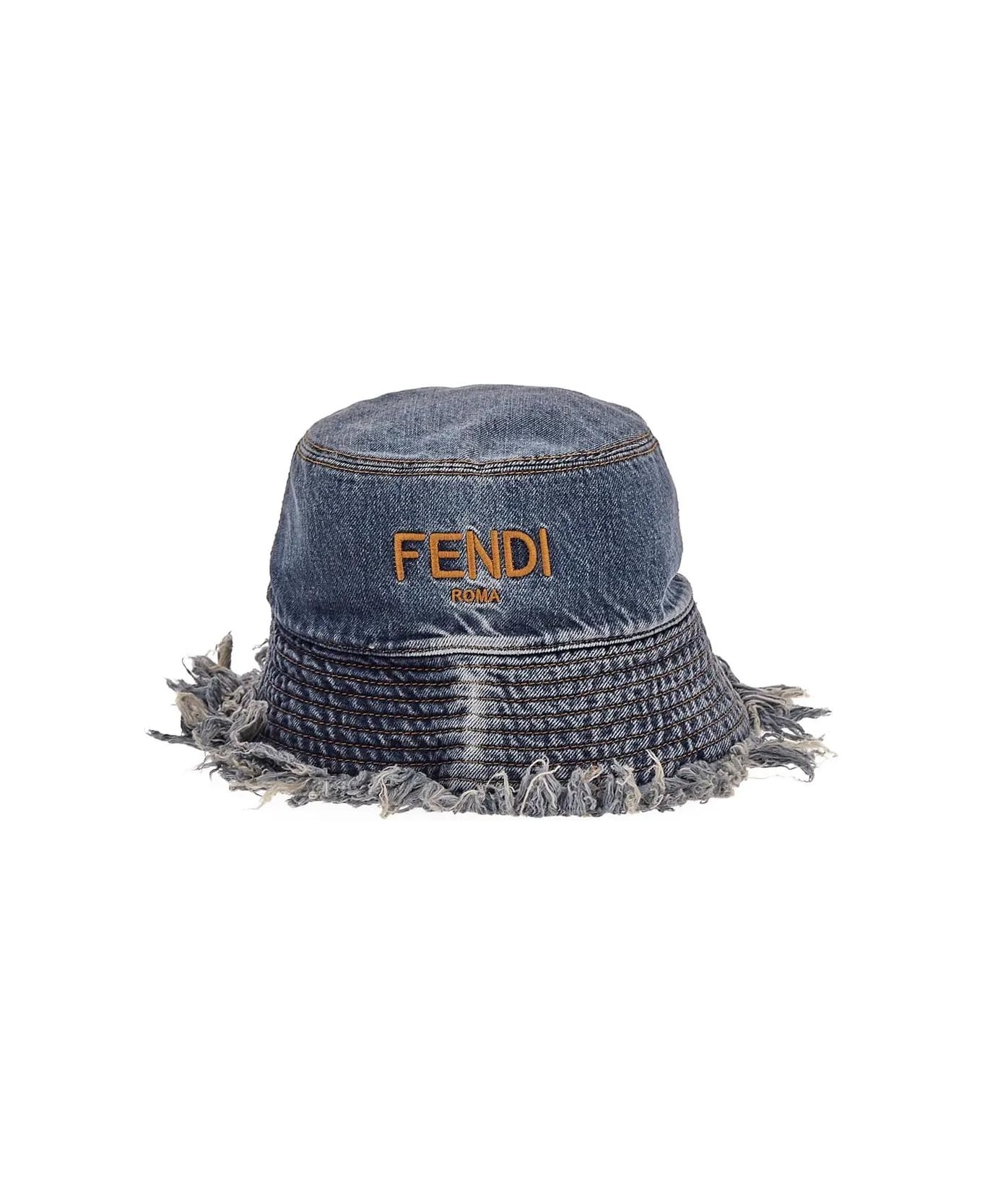 Denim Bucket Hat from Fendi Fendi bucket hat in blue denim with fringed edges and orange embroidered Fendi Roma logo on the front.