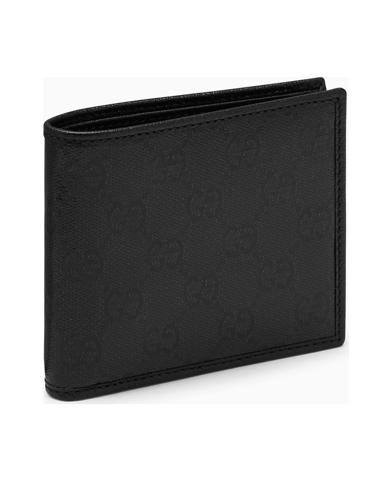 Bi-fold wallet by Gucci in black GG fabric, featuring two banknote compartments, four credit card slots and a coin pouch.