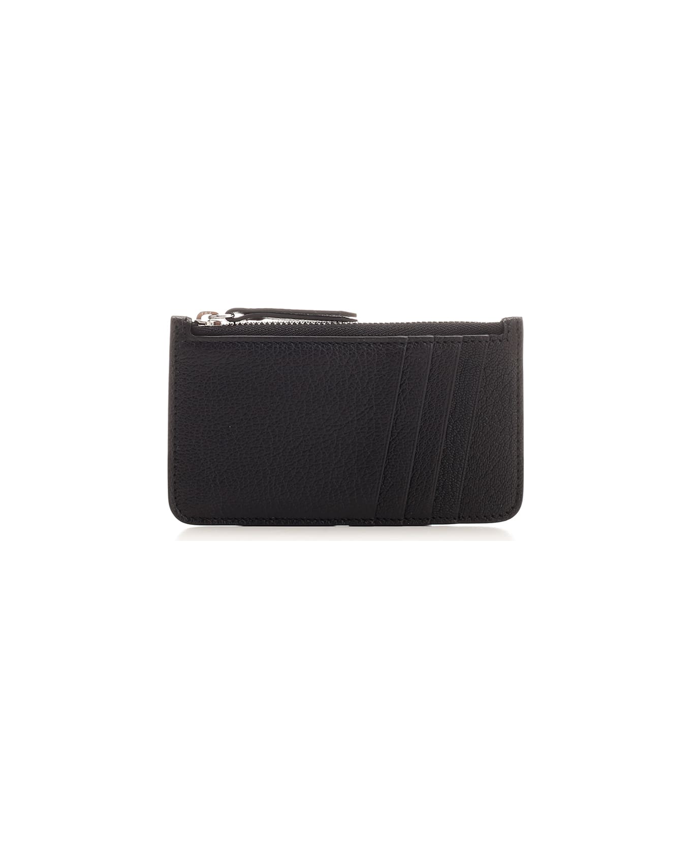 Black card holder in full grain leather with 4 card slots, zip compartment and 4 white stitching on the back from Maison Margiela. Composition: T1 100% PCP - T2 100% PCP - T3 100% VI - T4 100% OTN - T5 94% ZN 4% ALL 2% RME