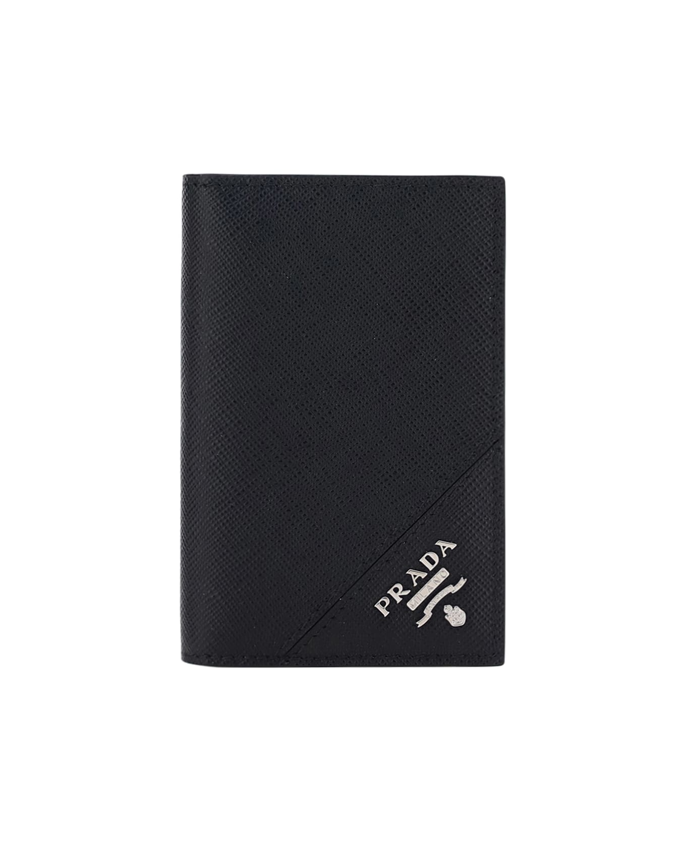 Saffiano Leather Card Holder by Prada, gold press-stamped logo on front, internal card slot with logo. Composition: 100% Calf Leather Bos Taurus