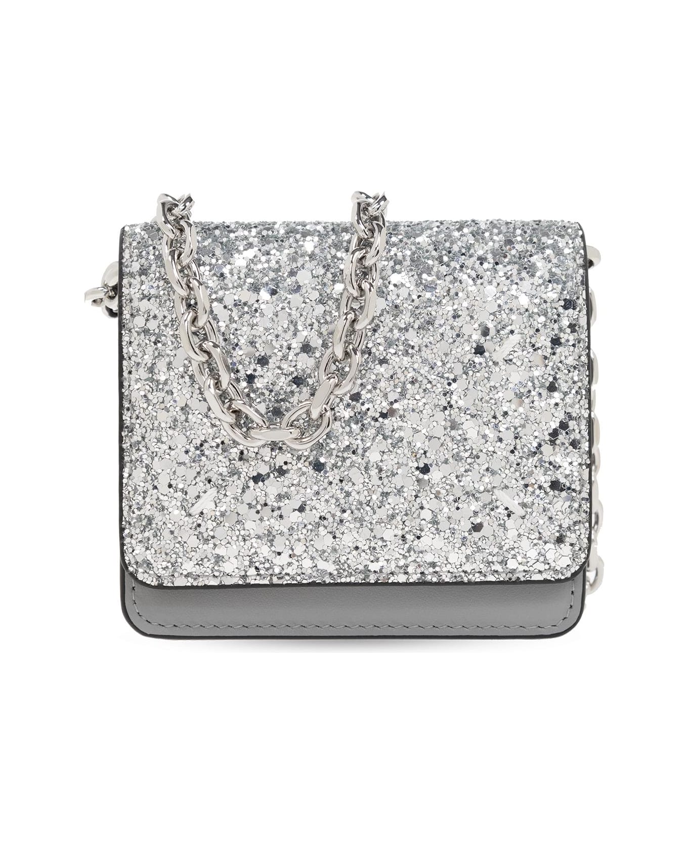 Grey folding wallet from Maison Margiela. Made of leather and spruced up with silver-tone glitter, this item fastens via a snap and showcases the brand's signature white four stitches. It is complete with a long, detachable and adjustable shoulder strap,