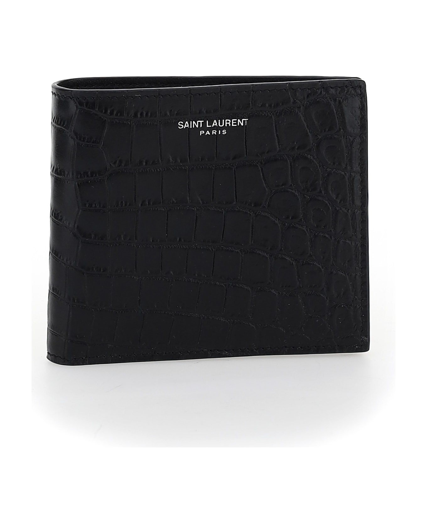 Calfskin wallet by saint laurent, rocodile effect print, billfold design, plaque with iconic brand monogram embossed on front, card slots, bill slot. Composition: 100% % Calf Leather Bos Taurus