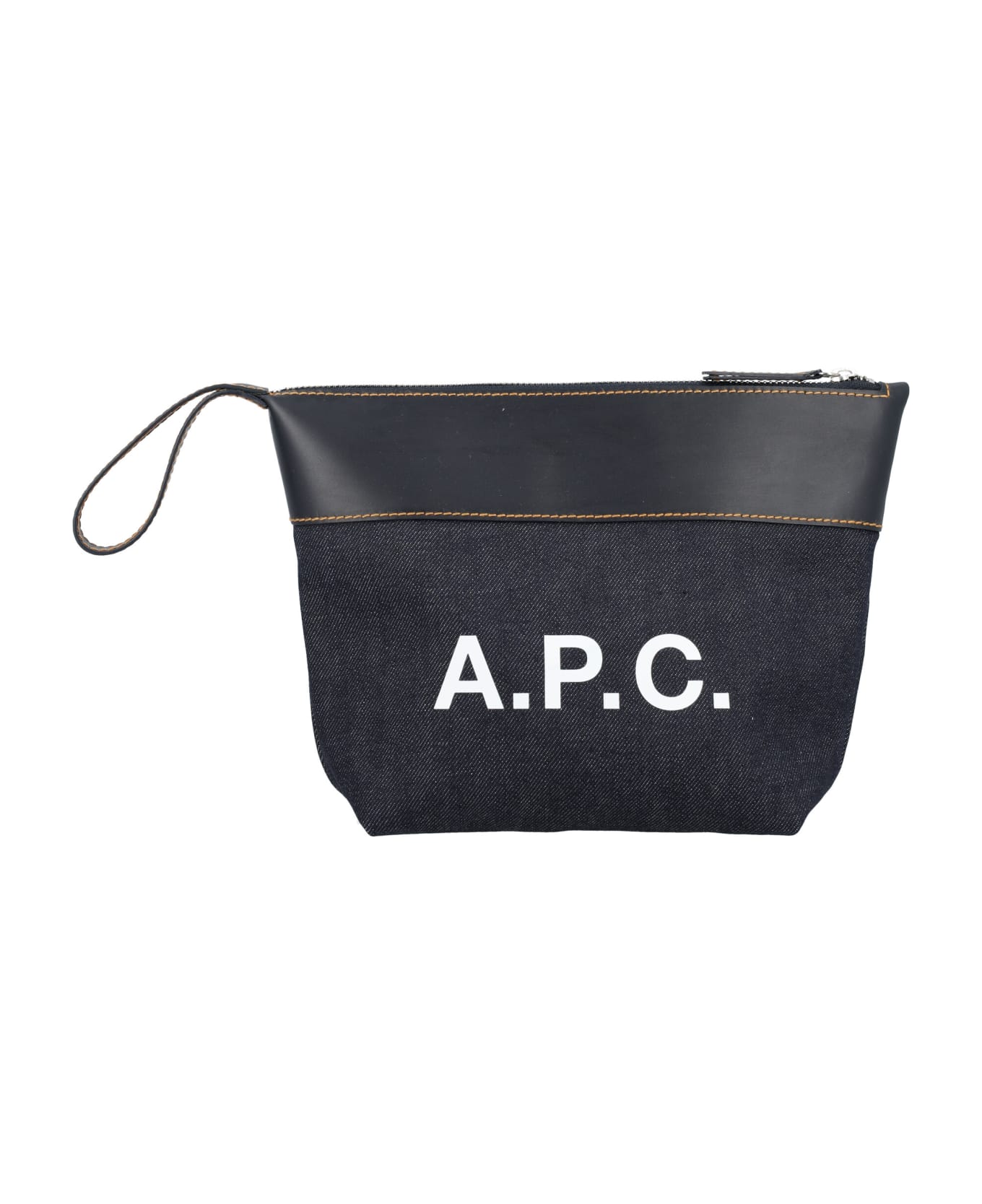Denim Axelle Pouch By A. p. c.. Featuring: Zip Fastening Leather Wristband Wide Leather Band White Logo Print At Front Contrast Stitching Width: 26 Cm Height: 18 Cm Depth: 8 Cm