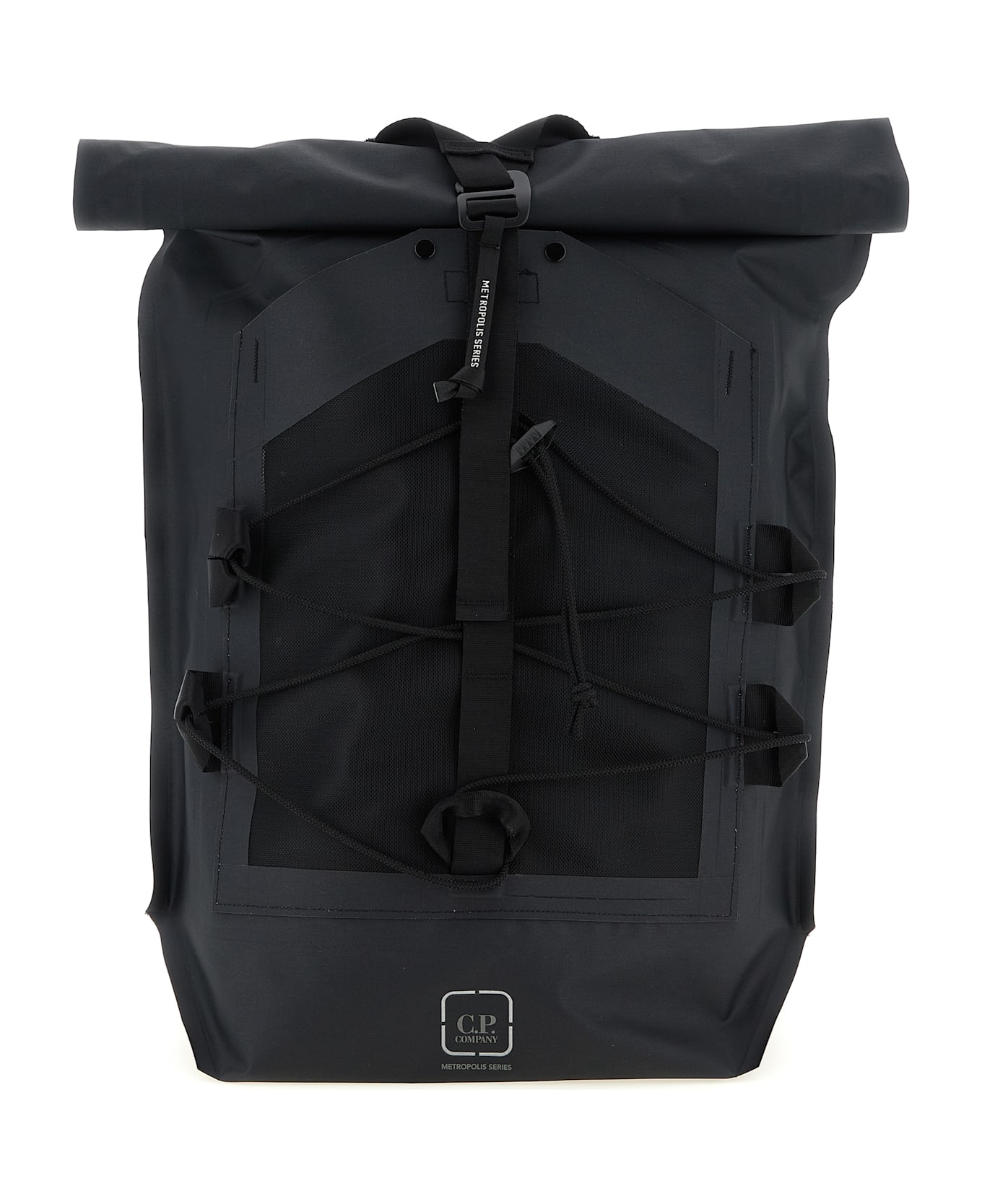 'The Metropolis Series' backpack in Rubber Reps Mixed, adjustable rollable velcro closure with snap buttons, front mesh pocket with drawstring, snap button and velcro flap, adjustable padded shoulder straps, pockets.