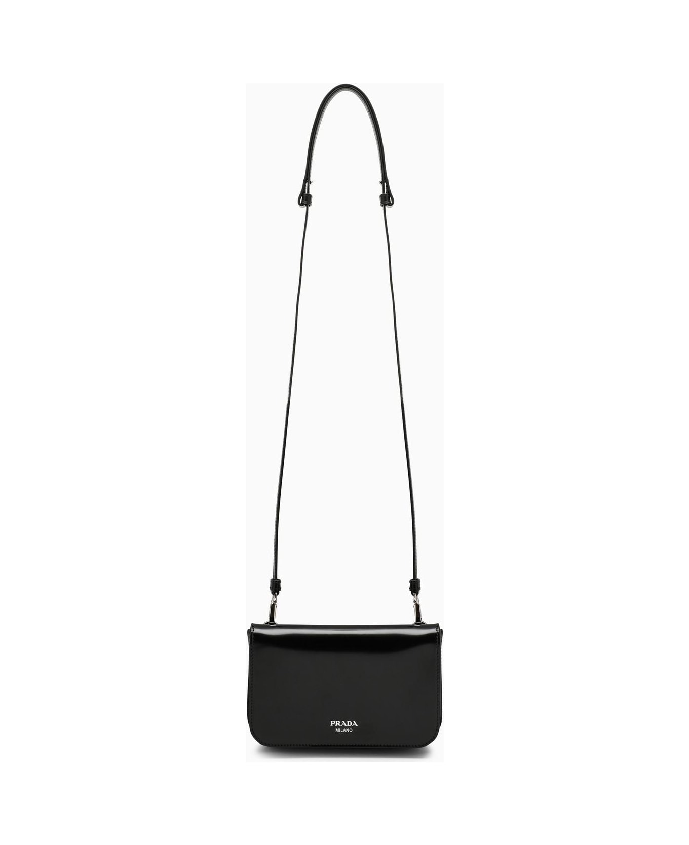 Black smooth leather Prada shoulder bag featuring a flap with magnetic closure, a logo on the front, an internal pocket and an adjustable, removable shoulder strap. Composition: 100% Leather