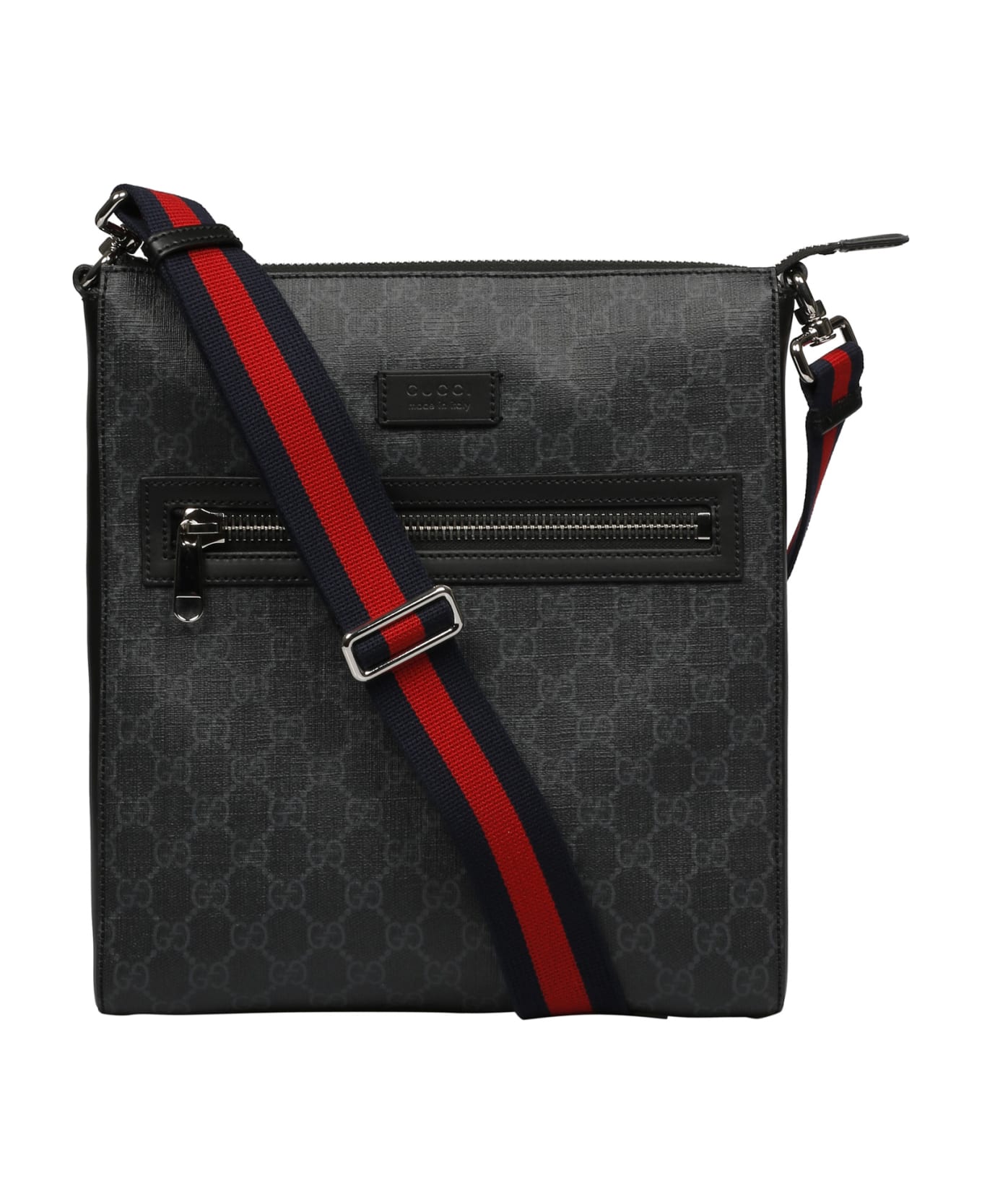 Messenger bad designed by Gucci realised with GG supreme fabric. The adjustable shoulder strap is made with Web fabric.