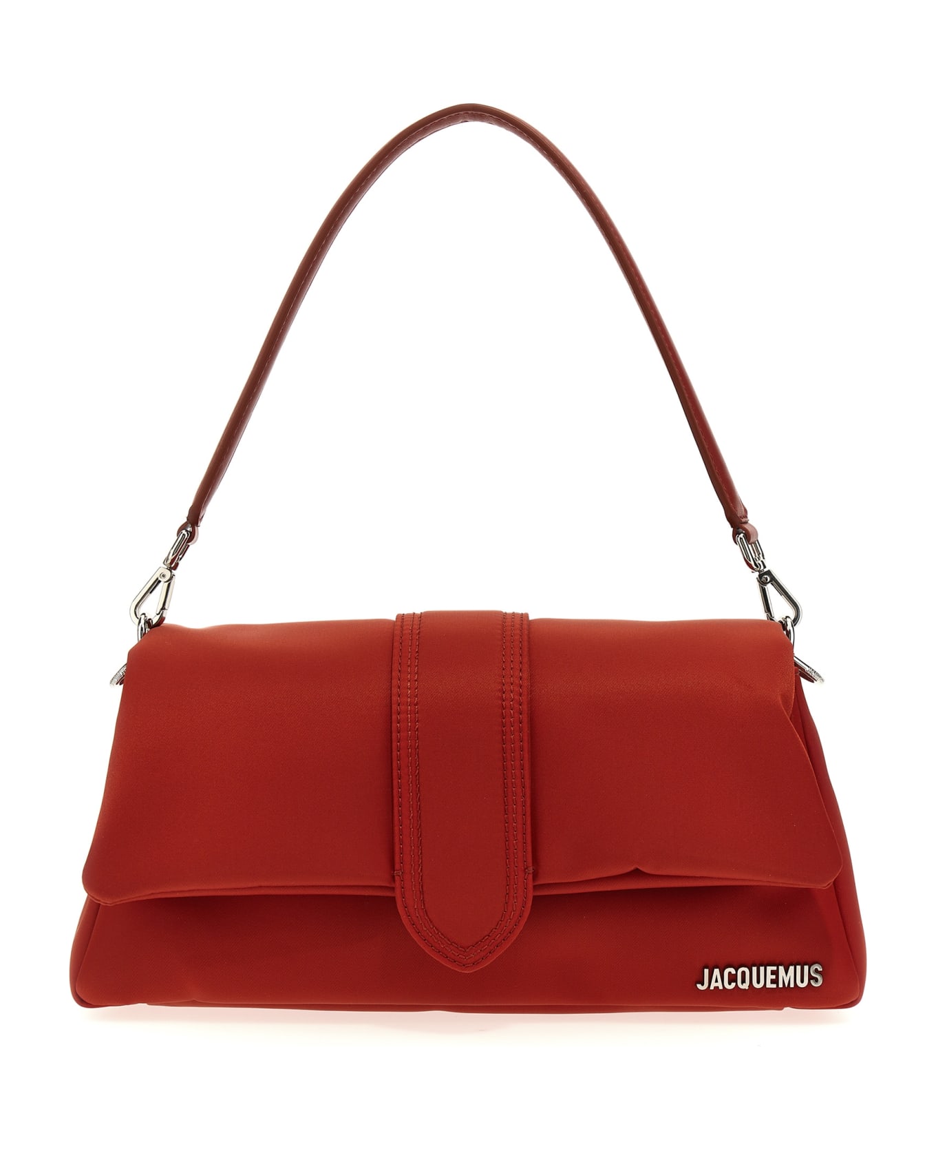 'Le Bambimou' nylon shoulder bag with magnetic flap closure, front metal logo appliqué, removable top handle, and removable shoulder strap. Composition: 90% polyamide 10% acrylic