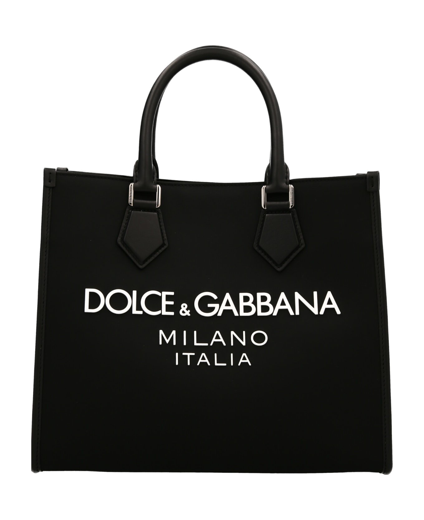 Nylon shopping bag with front logo print, leather details, n adjustable and removable shoulder strap. Composition: 50% polyamide 20% acrylic 15% viscose 15% leather