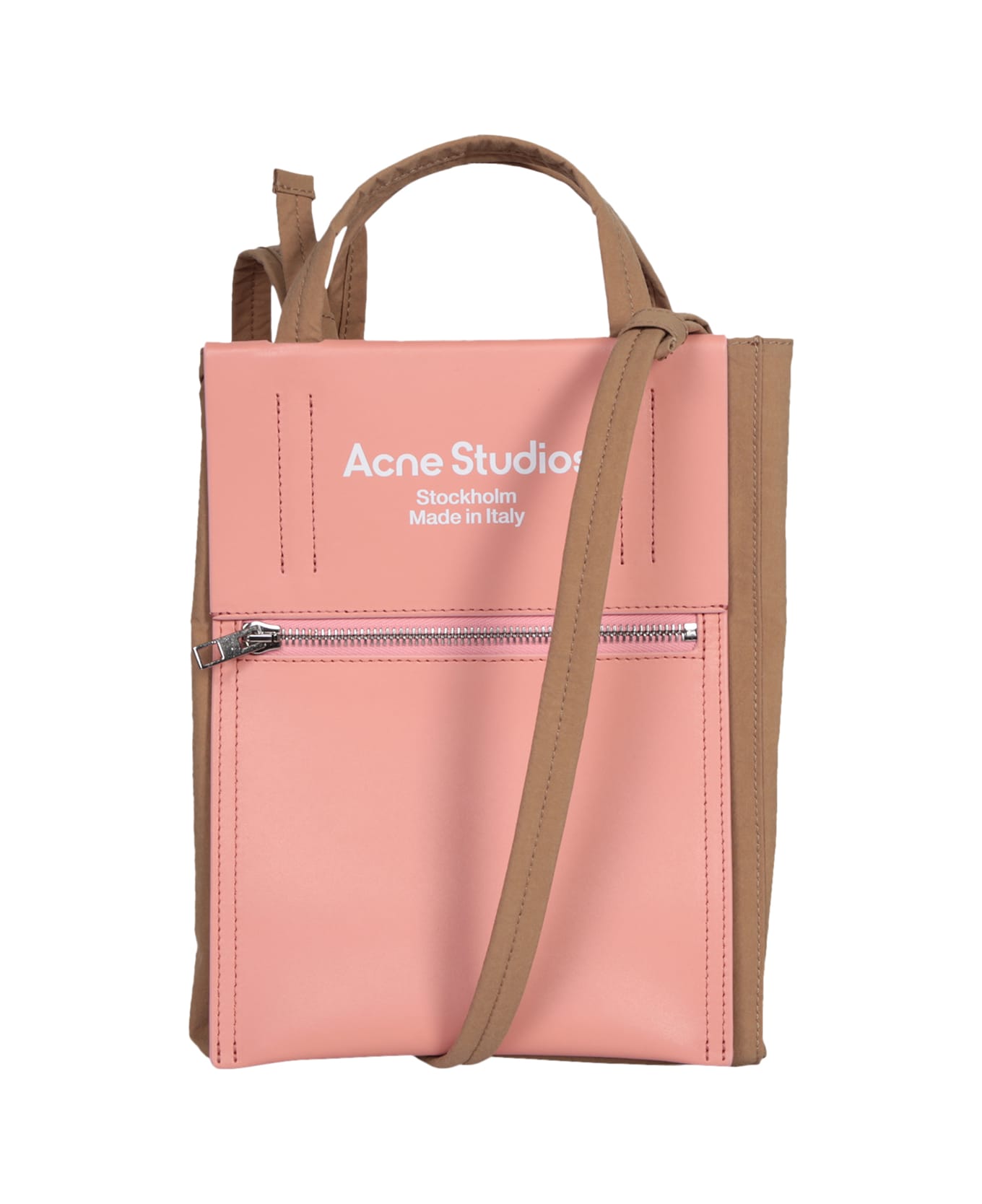Two rounded top handles. Logo print to the front. Open top. Leather strap. Front zip-fastening compartment. Color: Pink/ Beige