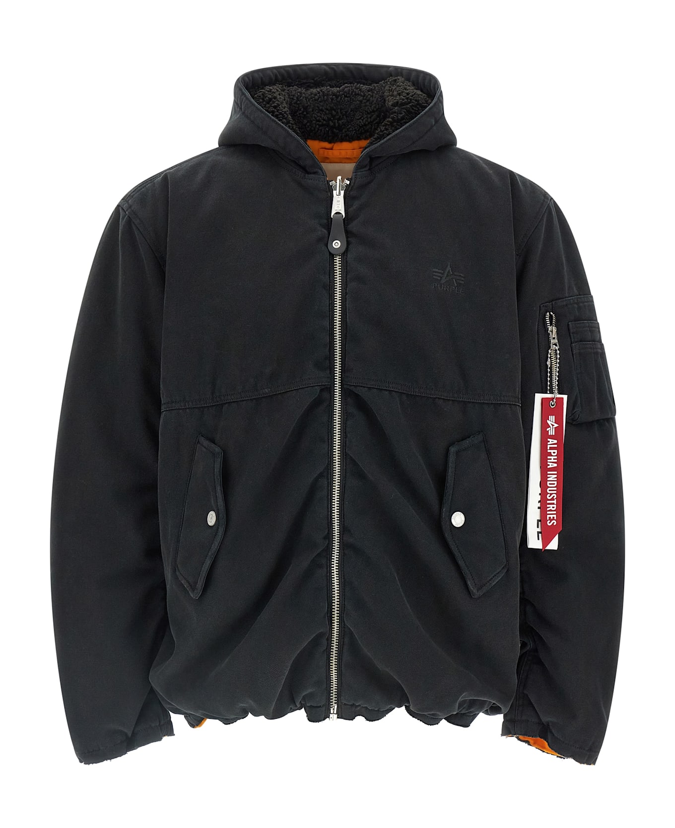 Alpha Industries x Purple reversible bomber jacket in padded cotton canvas and nylon color block, hood with shearling-effect fabric lining, embroidery and maxi logo patch, front zip closure, pockets, long sleeves, raw cut hem, elastic at the hem.