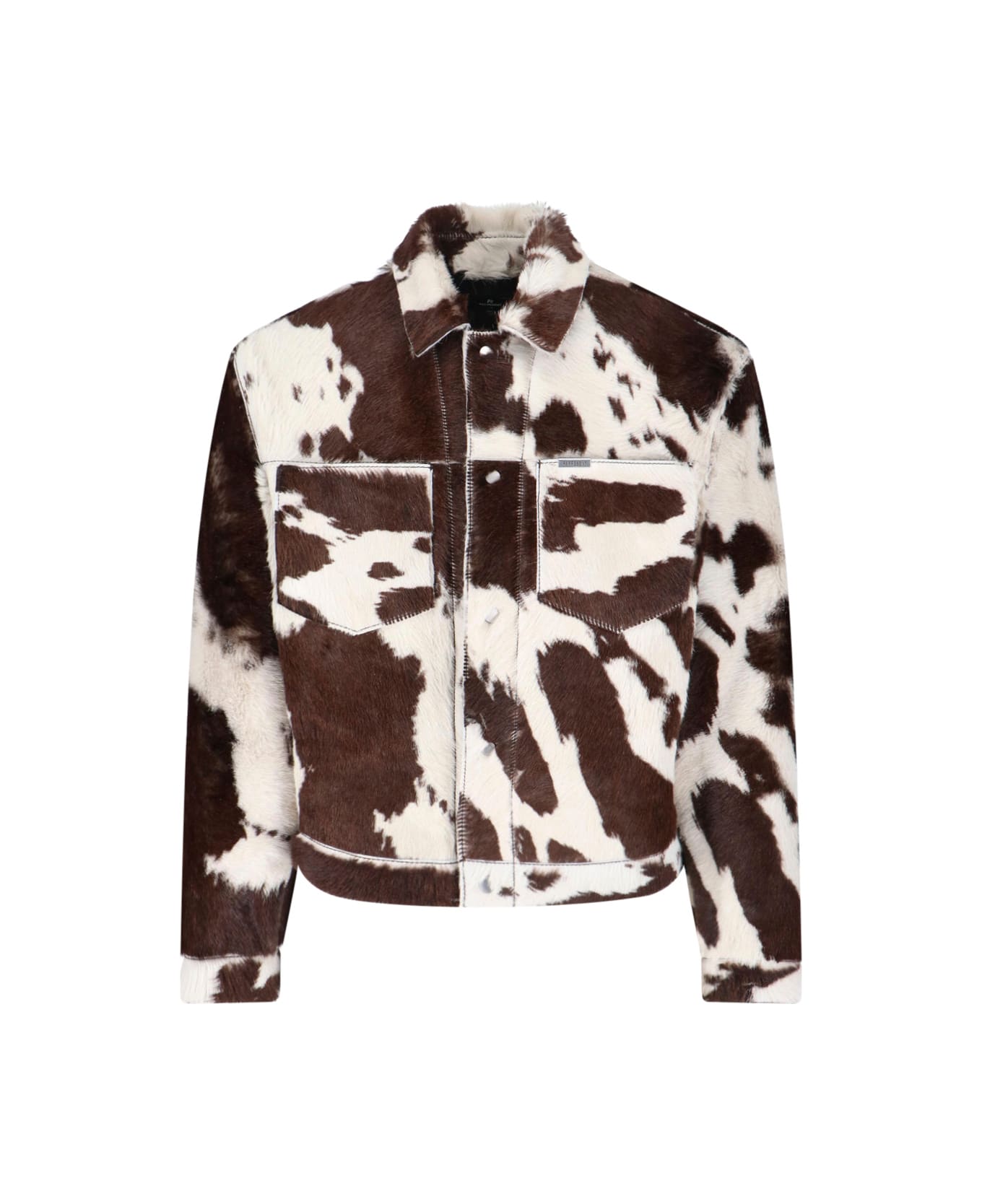 Represent multicolor leather animal print jacket, "Cow Print" pattern, collar, button closure, long sleeves, two front pockets. Composition: 100% Leather