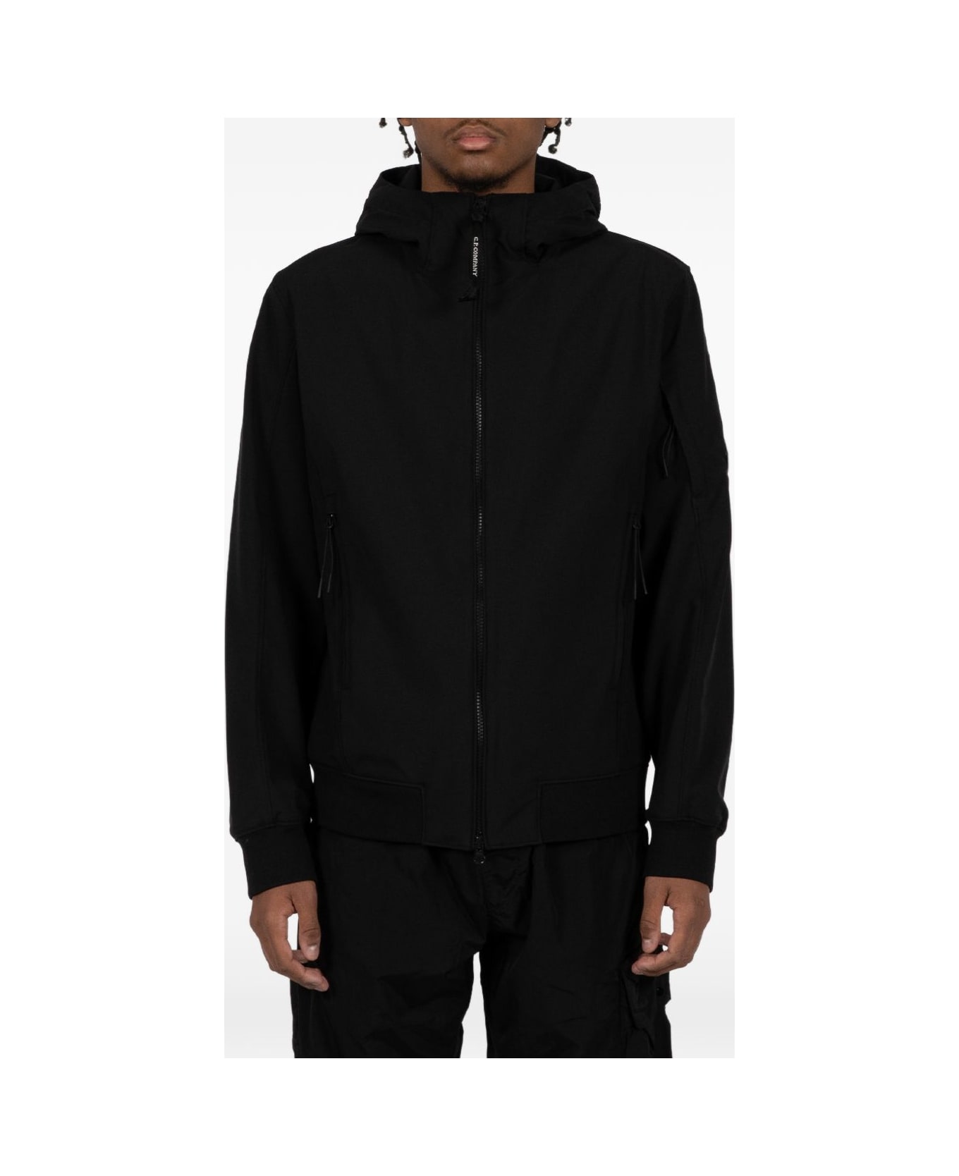 black, hooded, zip fastening, ribbed hem, ribbed cuffs, patch detail, C. P. Company suggests removing any detachable accessories before washing. Composition: 92% Polyester, 8% Elastane