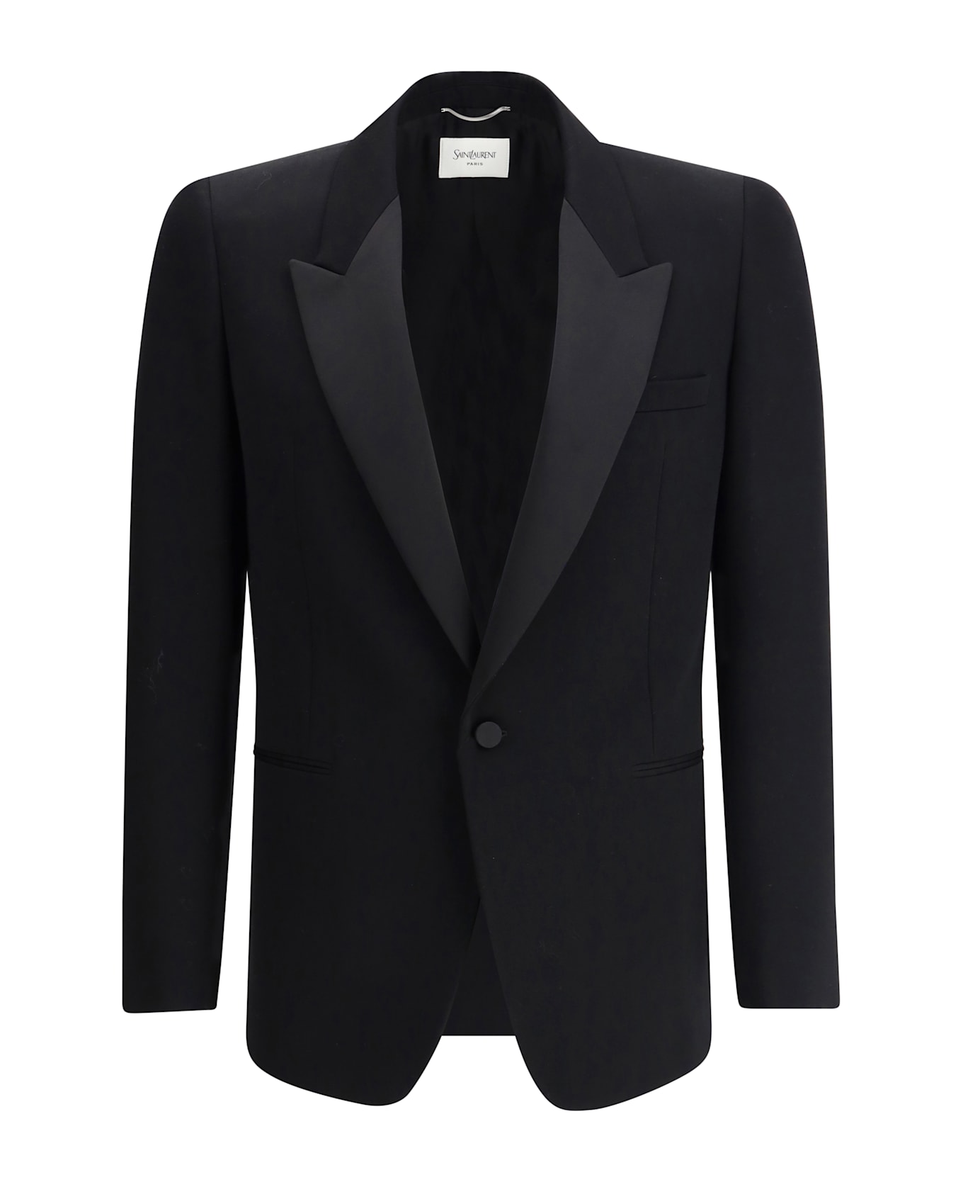 Saint laurent's elegant blazer is an elegantly styled garment, featuring spear lapels that give it a formal and distinctive look. the front closure features a single button, maintaining a clean and essential line. on the front, the blazer is enhanced by three welt pockets, which add a touch of practicality without compromising the elegance of the design. at the back, a delicate slit allows for greater freedom of movement. the cuffs are finished with three buttons, a detail that enhances the craftsmanship and sophisticated style of the garment.