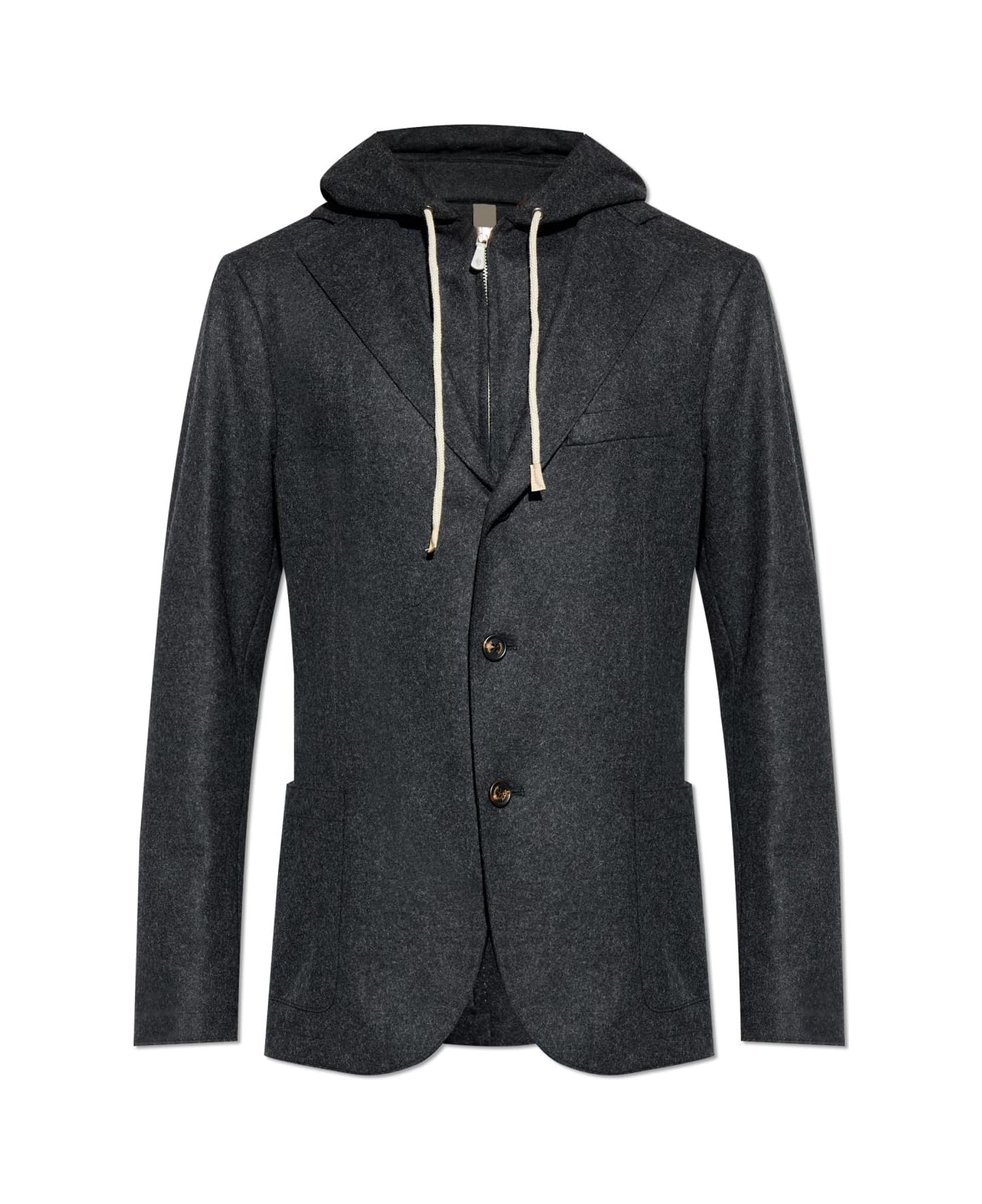 Experience the pinnacle of sophisticated tailoring with this wool blazer with detachable hood by Eleventy. Presented in a deep gray hue, this piece marries a classic, slim silhouette with a modern sensibility a testament to refined versatility. The slightly rounded hem and distinguished notch lapel elevate its timeless design, while the smooth, melange-effect wool offers a subtly textured and matte finish, underscoring its exclusive allure. A standout feature, the detachable hood with contrasting light drawstrings and a sleek zipper, brings an unexpected, urban-casual edge, perfectly blending formal structure with contemporary ease. Fastened with two elegantly placed buttons, this blazer is crafted for those who appreciate detail and distinction. Why choose this product? Exquisite woolen fabric with remarkable texture and sophistication Removable hood for versatile styling polished or relaxed Timeless slim fit for a flattering, modern silhouette Signature Eleventy craftsmanship for enduring quality
