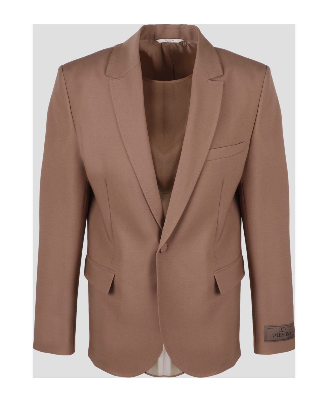 Single-breasted blazer by Valentino Garavani, in wool with Maison Valentino sartorial label and internal chiffon bib. - SS23 - Regular fit - Sartorial label on the bottom of the sleeve - Internal removable chiffon bib - Classic lapels - Button closure - Front pockets with flap - Welt chest pocket - Made in Italy - 100% Wool