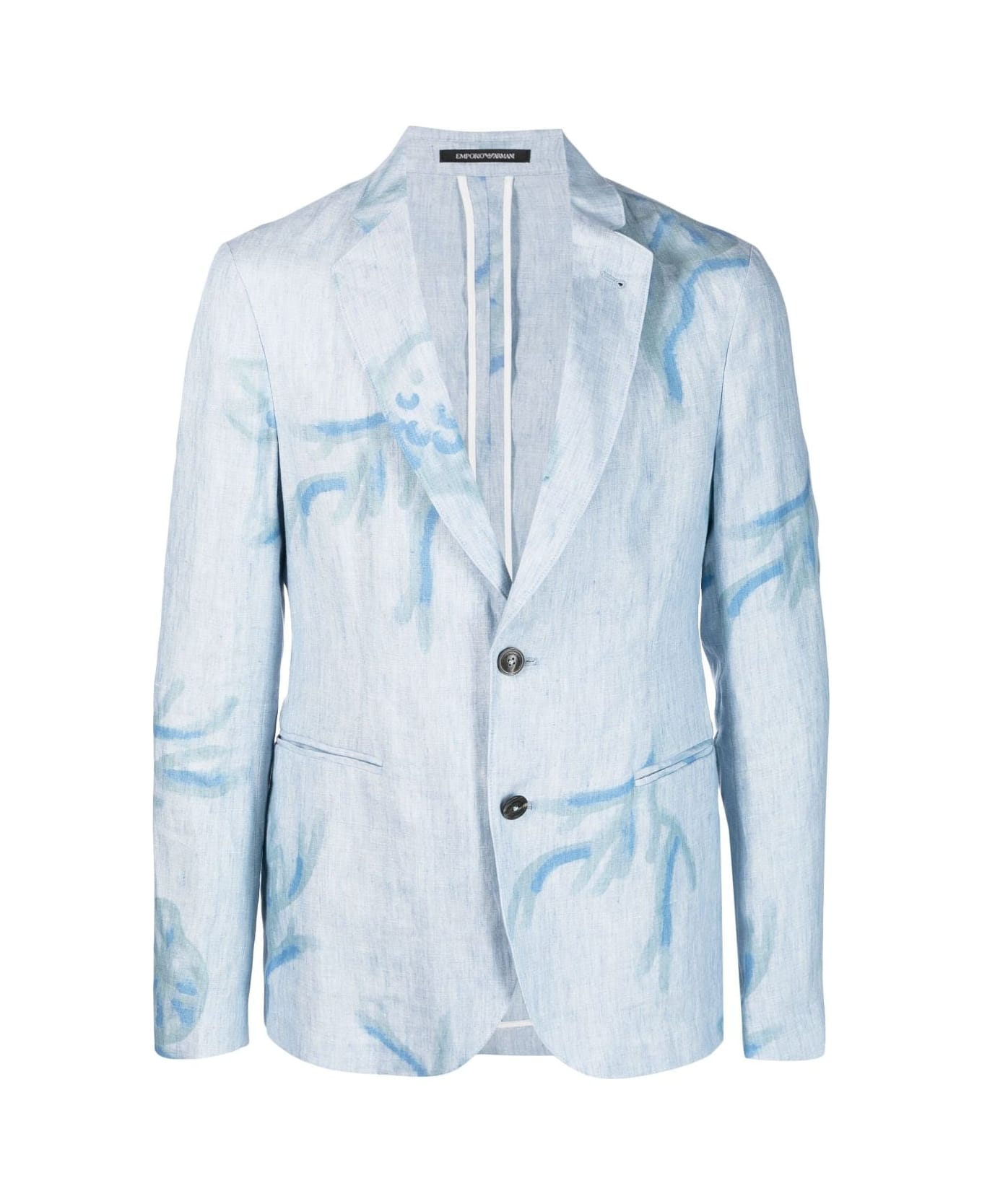 graphic-print linen blazer from EMPORIO ARMANI featuring light blue, linen/flax, all-over graphic print, front button fastening, long sleeves, two front welt pockets and buttoned cuffs.