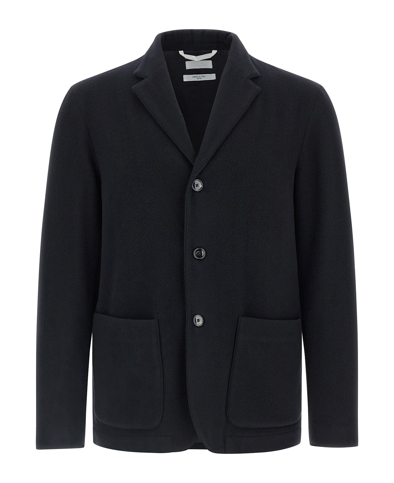 Deconstructed single-breasted wool blazer with two front button closure, mirror lapels, pockets, cuffs with open buttonholes, cupro lining.