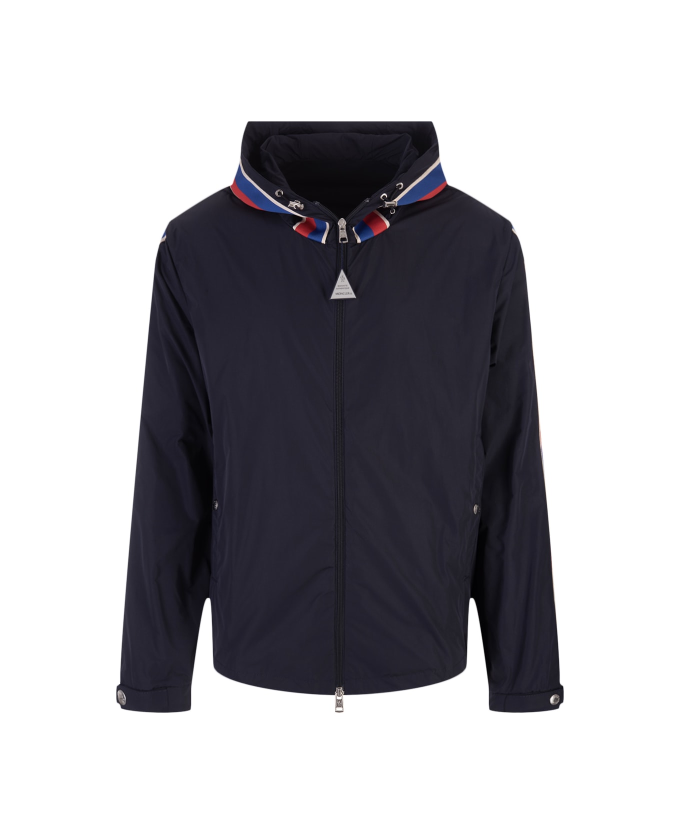 Men's Rukbat windbreaker by Moncler made of navy blue nylon and finished with iconic stripes on the sleeves and hood. The jacket features buttoned cuffs, a hood with elastic drawstring, side buttoned pockets and a two-way zip fastening.