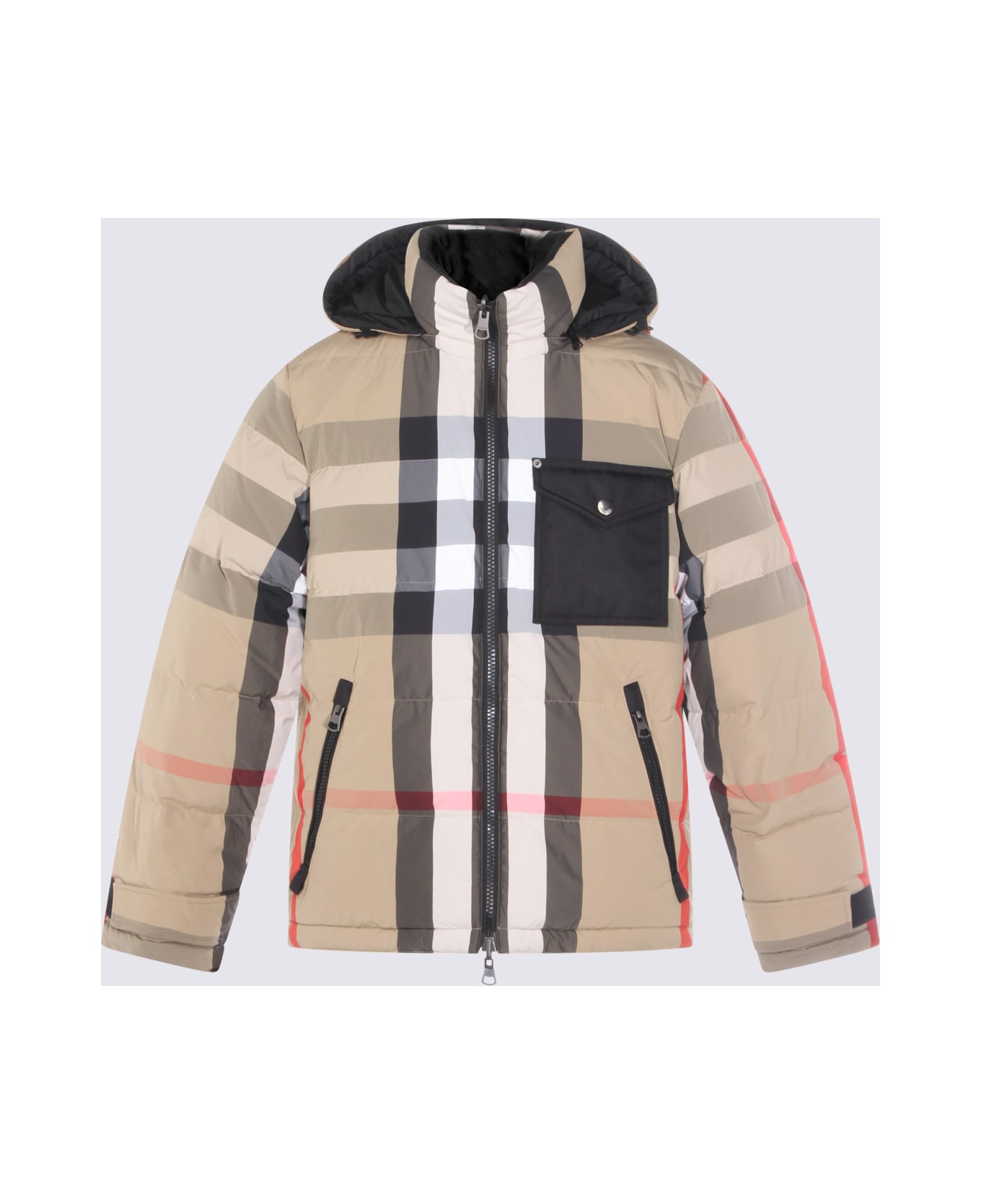 Beige down jacket from Burberry featuring long sleeves, hood, all over check motif, pockets and regular vestibility. Composition: _, 100% Polyamide