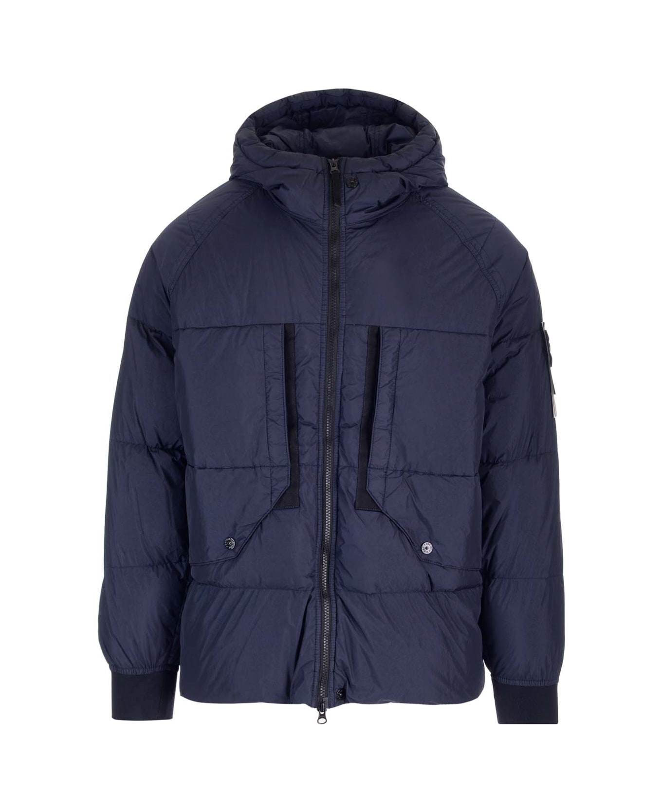 Blue down jacket from Stone Island in nylon, padded hood with double internal drawstring, raglan sleeves, two pockets with triangular flap and snap fastening, Stone Island badge on the left sleeve, ribbed cuffs, closure with two double-way zips.