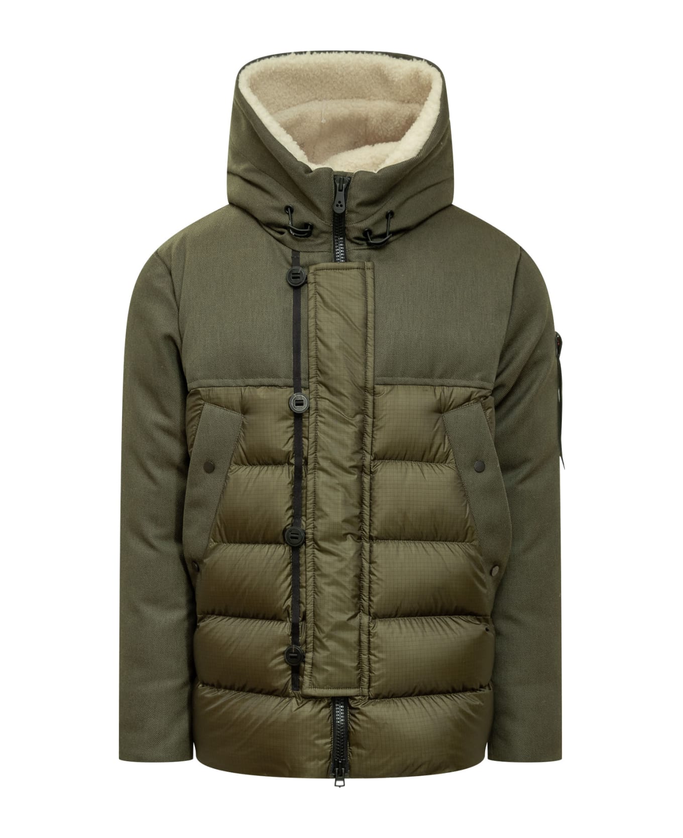 Green down jacket with hood. Long sleeves. Button and zipper closure. Pockets with buttons. Teddy woven hood lining.