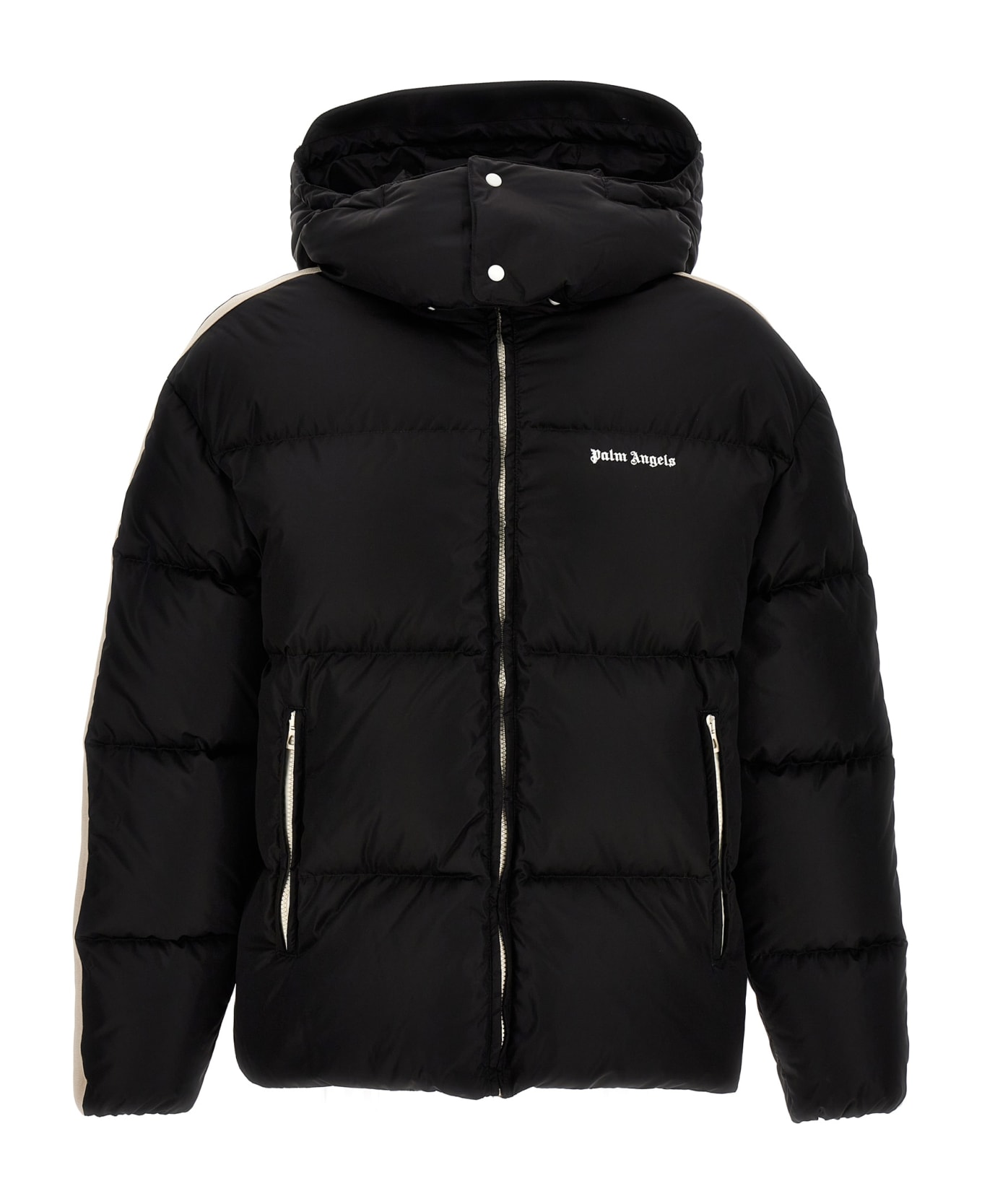 Padded fabric down jacket with hood, zip closure. Logo embroidery on the chest and contrasting side bands. Composition: 100% polyamide