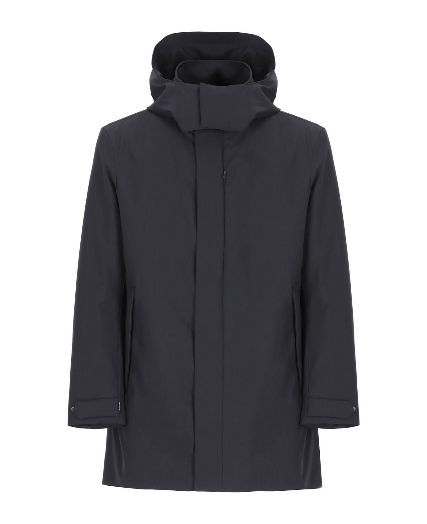 - Save The Duck dark blue man's padded coat - Removable hood with drawstrings - Long sleeves - Front zip and buttons fastening - Three front zip fastening - Relief logo at left sleeve - One rear vent at hem