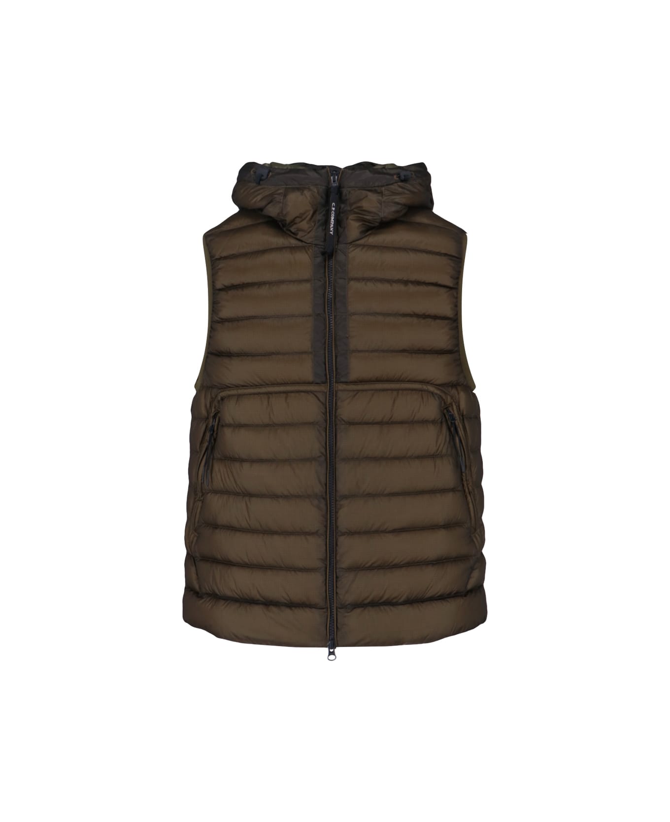 C. P. Company 'Goggle Down' padded vest in green D. D. Shell fabric with quilted and padded design, lens detail hood, zip closure, two side zip pockets, straight hem. Composition: 100% Polyamide