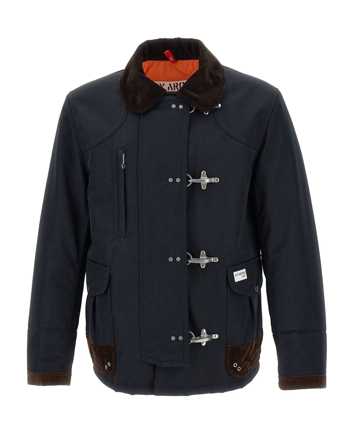 Fay Archive '4 Ganci' men's jacket, navy blue, iconic fastening with metal hooks, water-repellent and breathable nylon cordura fabric, dark brown suede details, bright orange diamond quilted lining, wadding padding, collar in dark brown corduroy, pocket with zip, large pockets with flap and snap and applied logo patch, front fastening with hidden snap fasteners, ideal garment for autumn and winter season. Made in Italy.