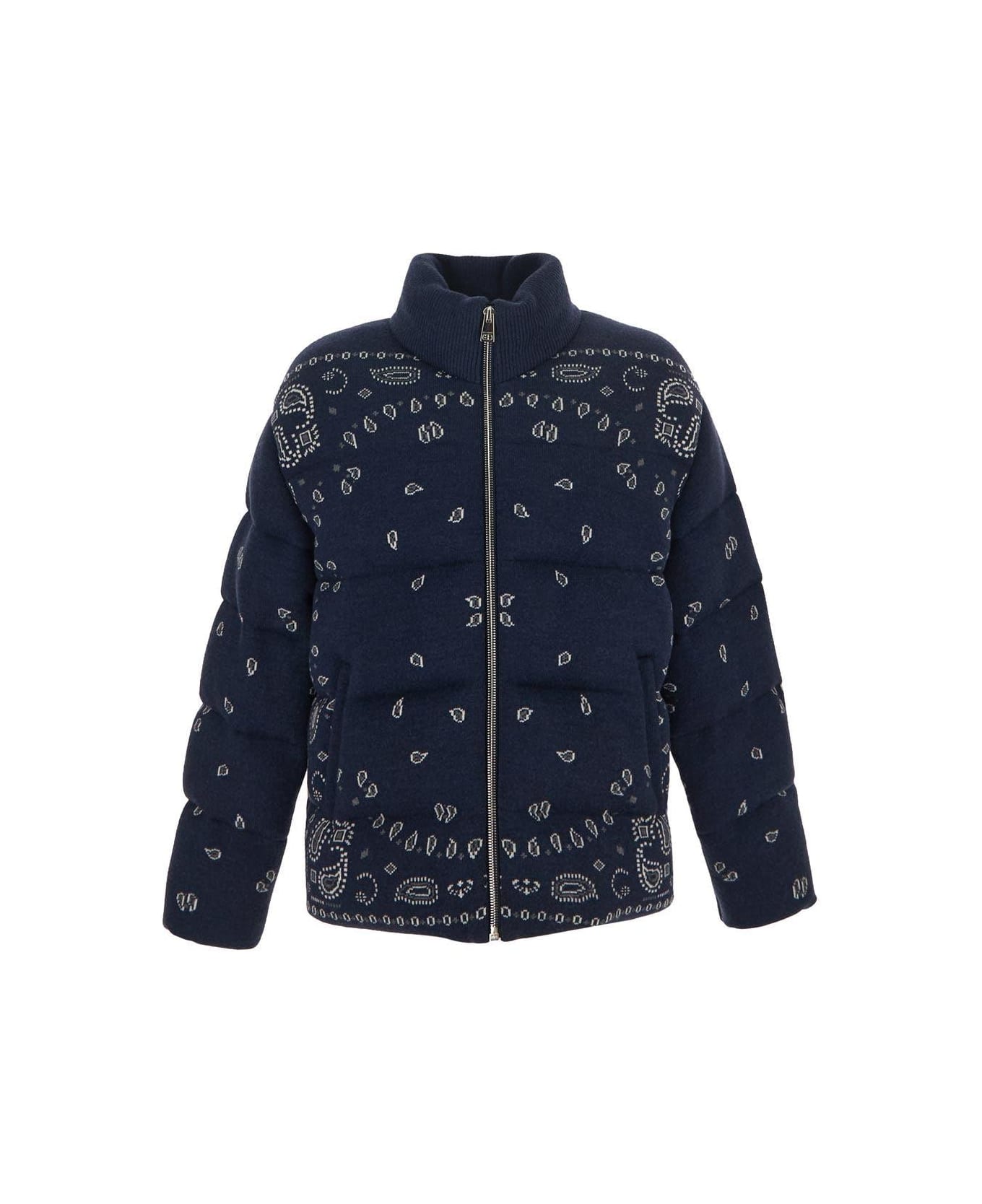 Alanui pufefr jacket in navy wool with bandana pattern. The item is featured by a ribbed collar, two front pockets and an oversize fit.
