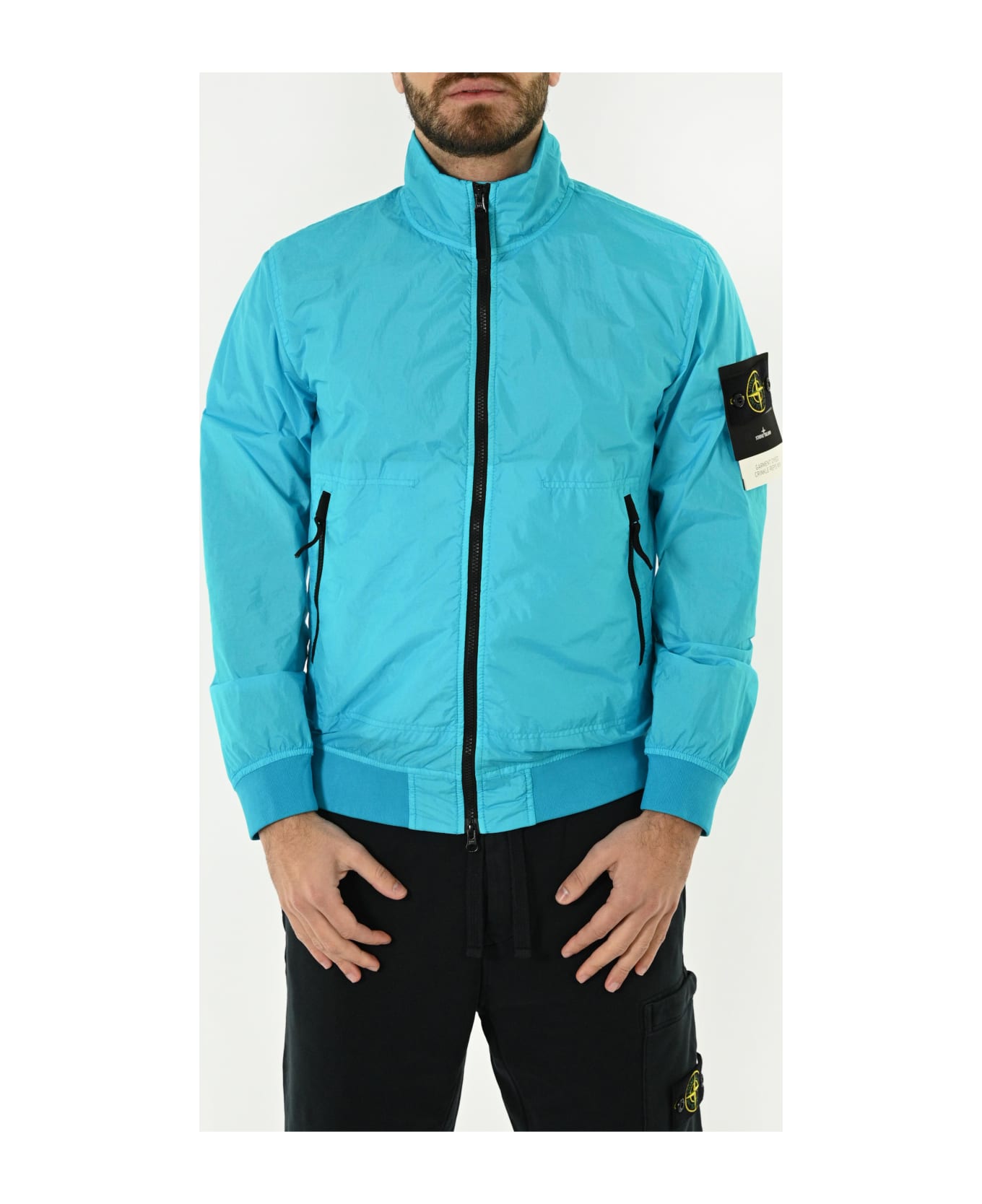 stand collar with ribbed jersey inner lining. two slightly diagonal standing pockets with zip fastening. stone island badge on left sleeve. ribbed cuffs and bottom. nylon mesh lining. double slider zip closure. composition