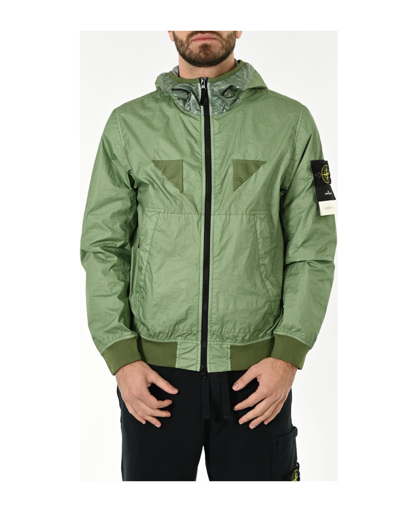 jacket with hood in membrana 3l tc, a 3-layer light performance fabric composed of an outer layer in opaque nylon laminated to a breathable and water-resistant membrane, protected by an impalpable layer of polyester. stone island's garment dyeing experience gives an exceptional color to the outer layer while preserving the performance characteristics of the inner membrane. the addition of a special agent to the dye recipe makes the garment drip-free. style