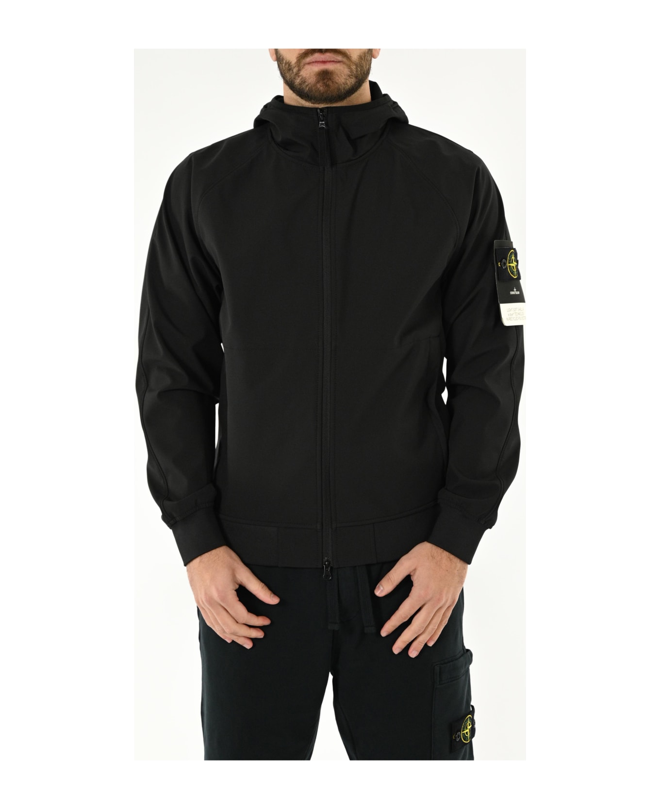 jacket with hood made of a 3-layer performance material resistant to a water column of 8000 mm. the outer side in 100% recycled stretch polyester canvas is woven with yarns that use e. dye® waterless color system technology, the innovative yarn color saturation system that reduces the use of water by 85% and 90% of the chemicals used in the dyeing process. the fabric is laminated to a breathable, wind and water resistant internal membrane protected by a 100% recycled textured polyester jersey backing layer. the external structure of the material gives great flexibility and comfort to the garment. style hood trimmed in elasticated tape. welt pockets, closed by zip partially hidden by a narrow oblique flap. stone island badge on left sleeve. ribbed cuffs and bottom. double slider zip closure. composition garment: exterior: 92% polyester 8% elastane membrane: 100% polyurethane lining: 100% polyester