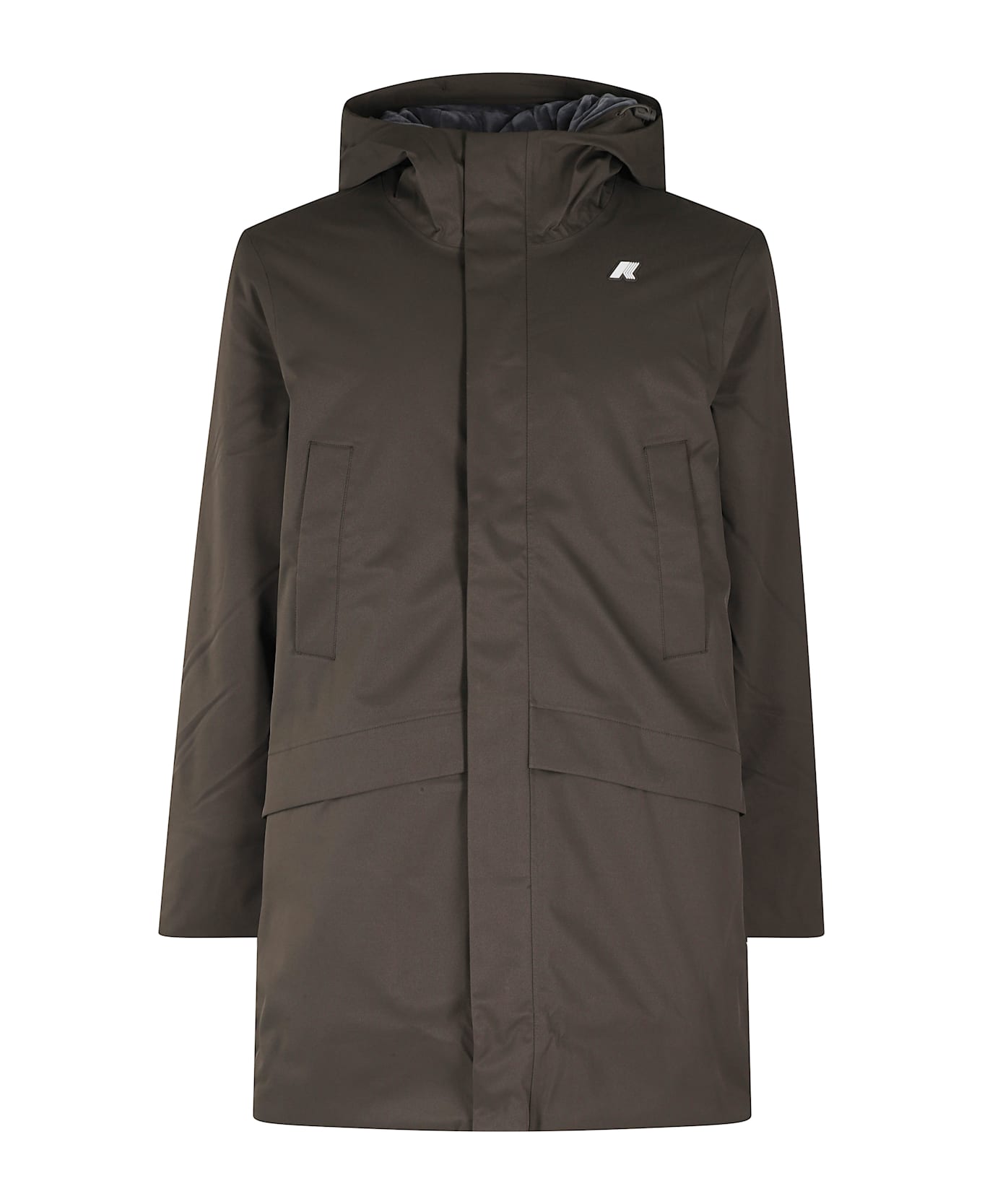 Jarno jacket - K-Way - Green color - Waterproof twill fabric with fleece lining - Adjustable drawstring hood - Elasticized inside cuff - Slanted welt chest pockets - Flap pockets with side snap closures - Silicone logo applique on chest - Front zipper and concealed button closure - Knee length - Regular fit