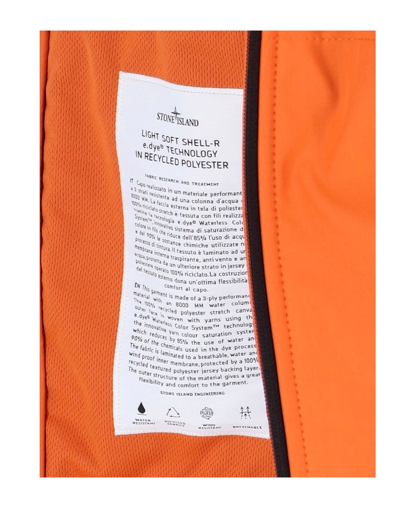 Stone Island Logo Hooded Jacket, made of orange SOFT SHELL-R e. dye® fabric, hood, front zipper closure, two side zipper pockets, sleeve logo patch, ribbed trim, straight hem.