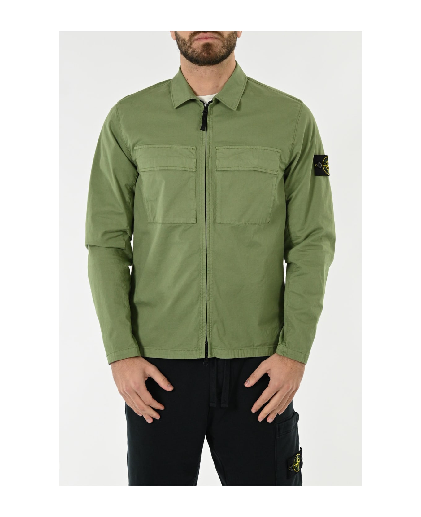 oversized shirt in stretch supima® cotton twill, made of mercerized supima® cotton yarn, with stretch in the weft. supima® - superior pima - is the guarantee certificate for the us origin of pima cottons. it is the noblest quality among cottons, due to the greater length, uniformity and resistance of the fibers. garment dyed. style two patch pockets on the chest, with fixed flap. stone island badge on left sleeve. automatic at the wrists. double slider zip closure. composition 97% cotton 3% elastane