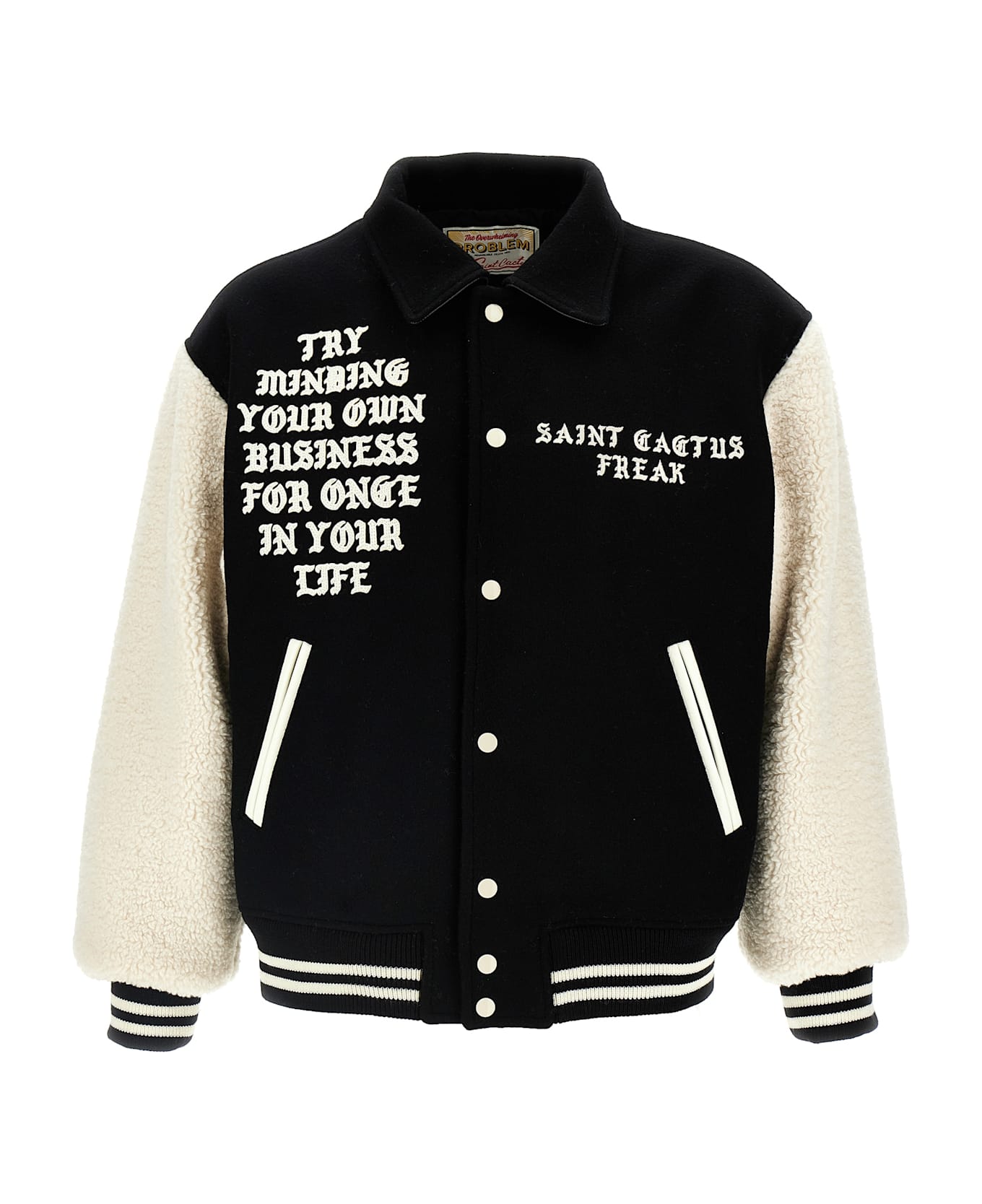 Varsity' wool bomber jacket with long teddy-effect sleeves with knitted cuffs, snap button closure, embroidery and patches, pockets. Composition: 90% wool, 10% nylon