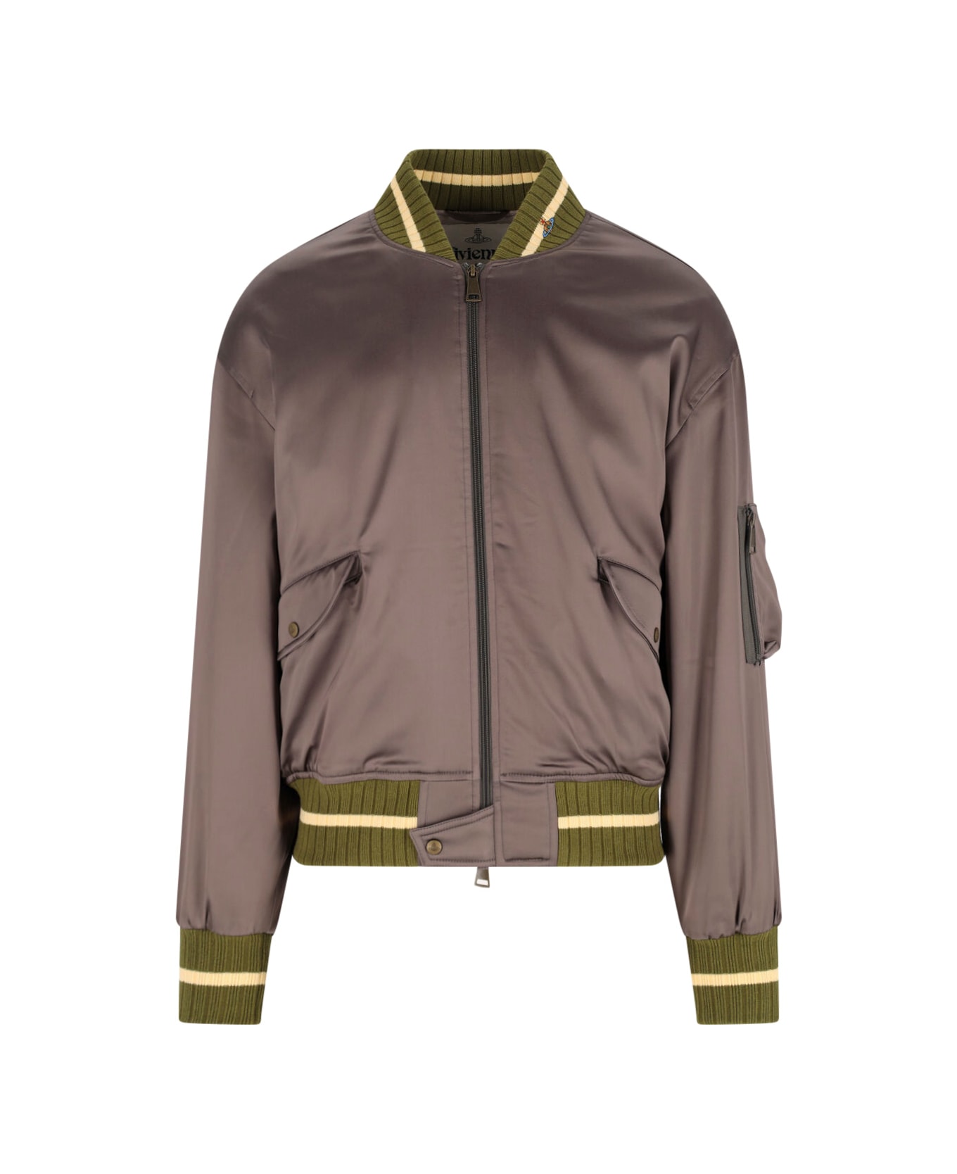 Vivienne Westwood logo zip jacket in taupe fabric with crewneck, multicolor "Orb" logo embroidery detail, double zip closure, two side button flap pockets, one zip patch pocket on the sleeve, ribbed trim, beige and green striped pattern detail, straight hem.
